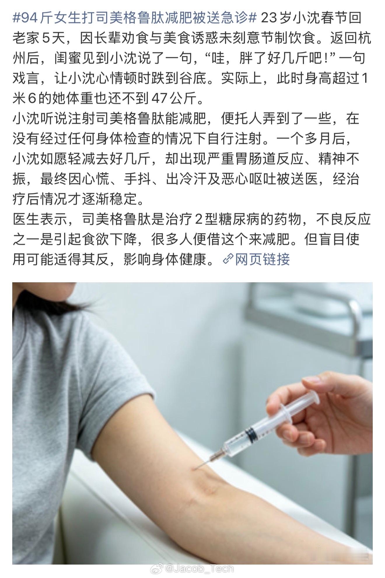 94斤女生打司美格鲁肽减肥被送急诊那些随便评论别人身材的人真的该把嘴巴给缝起来