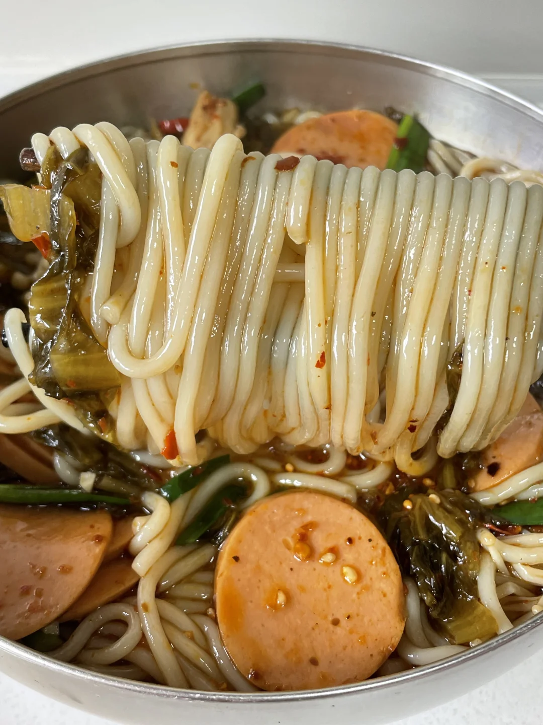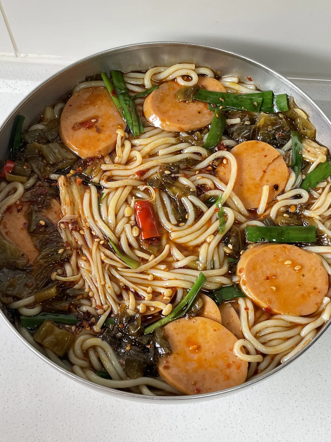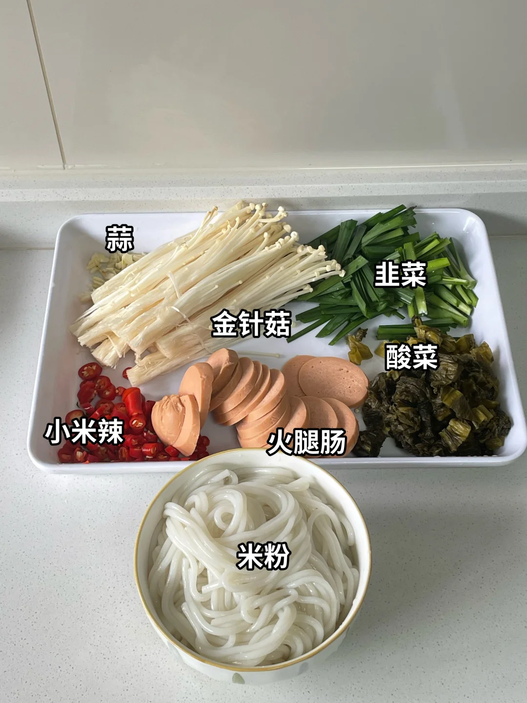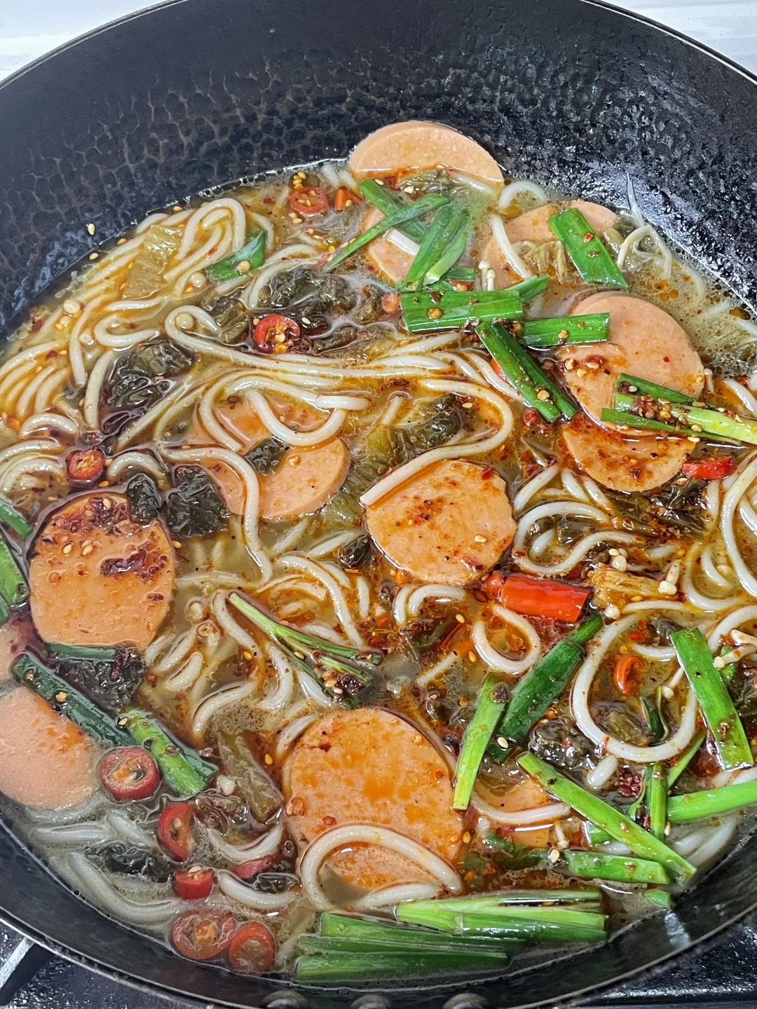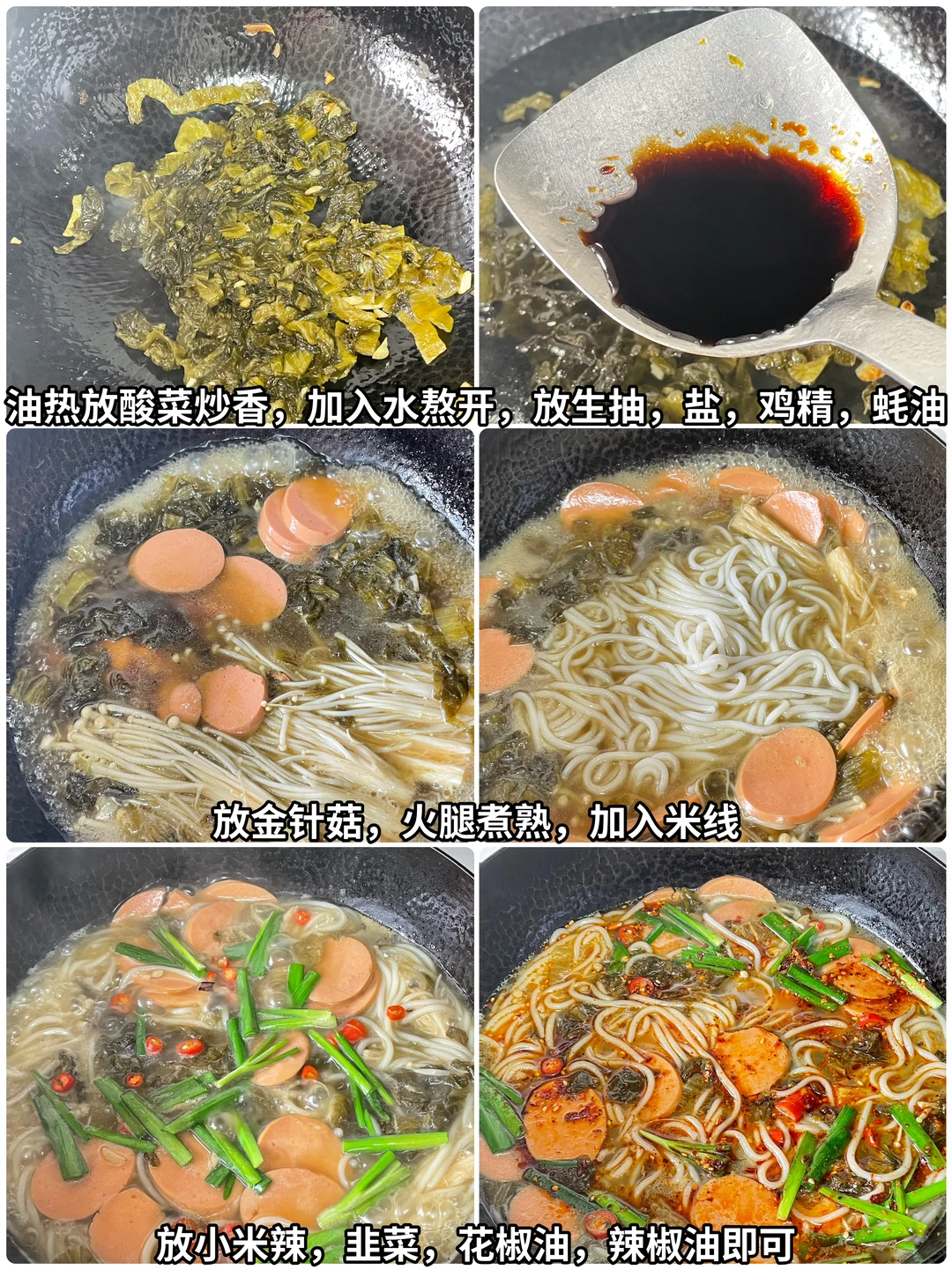 姐妹们,对于爱嗦米线的我来说,一周差不多得吃个五六次。今天这个米线我妈都说,让我去开个店。这个酸菜火腿肠米线,酸辣过瘾,米线顺滑,一口嗦下去,简直太满足了。 🌶️食材:米线 👩🍳做法如下⬇️ 油热放入酸菜和蒜末炒香,加入水熬开,放入生抽、盐、鸡精、蚝油煮出味道来,加入金针菇、火腿肠煮熟,再放入米线煮熟,加入小米辣、韭菜、花椒油、辣椒油,煮开即可出锅