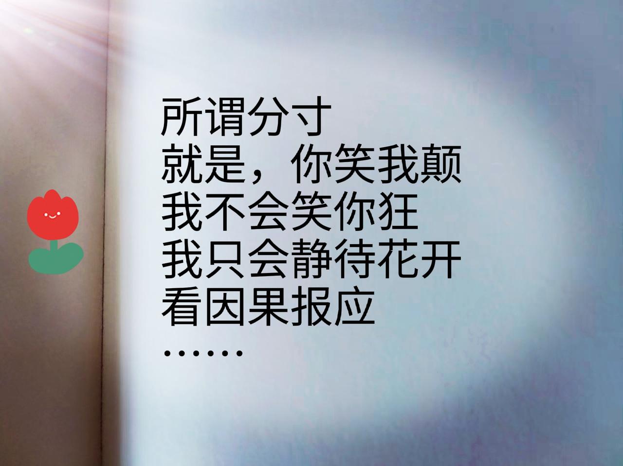 所谓分寸 就是,你欲哭我跟着哭 绝不会笑场 你欲笑我跟着笑 绝不会哭…… 所谓分寸 就是,你帮我,我帮你 绝不会落井下石 你笑我癫,我不会笑你狂 我只会静待花开…… 所谓分寸 就是,聚餐的时候 你不动筷,我绝不会先动筷 你不离场我也不会离场 倘若你让我不爽 那就别怪我 从此江湖两相忘…… 所谓分寸 就是,夫妻间 你可以不懂我,也可以不帮我 但绝不可以超越我的底线 你可以有你的自由空间 只要别玩火就行 所谓分寸 就是,婆媳间 要有边界感 要懂得互相尊重 不要耍小聪明 互不干扰 便好 各位 你们赞同我说的吗 人生感悟