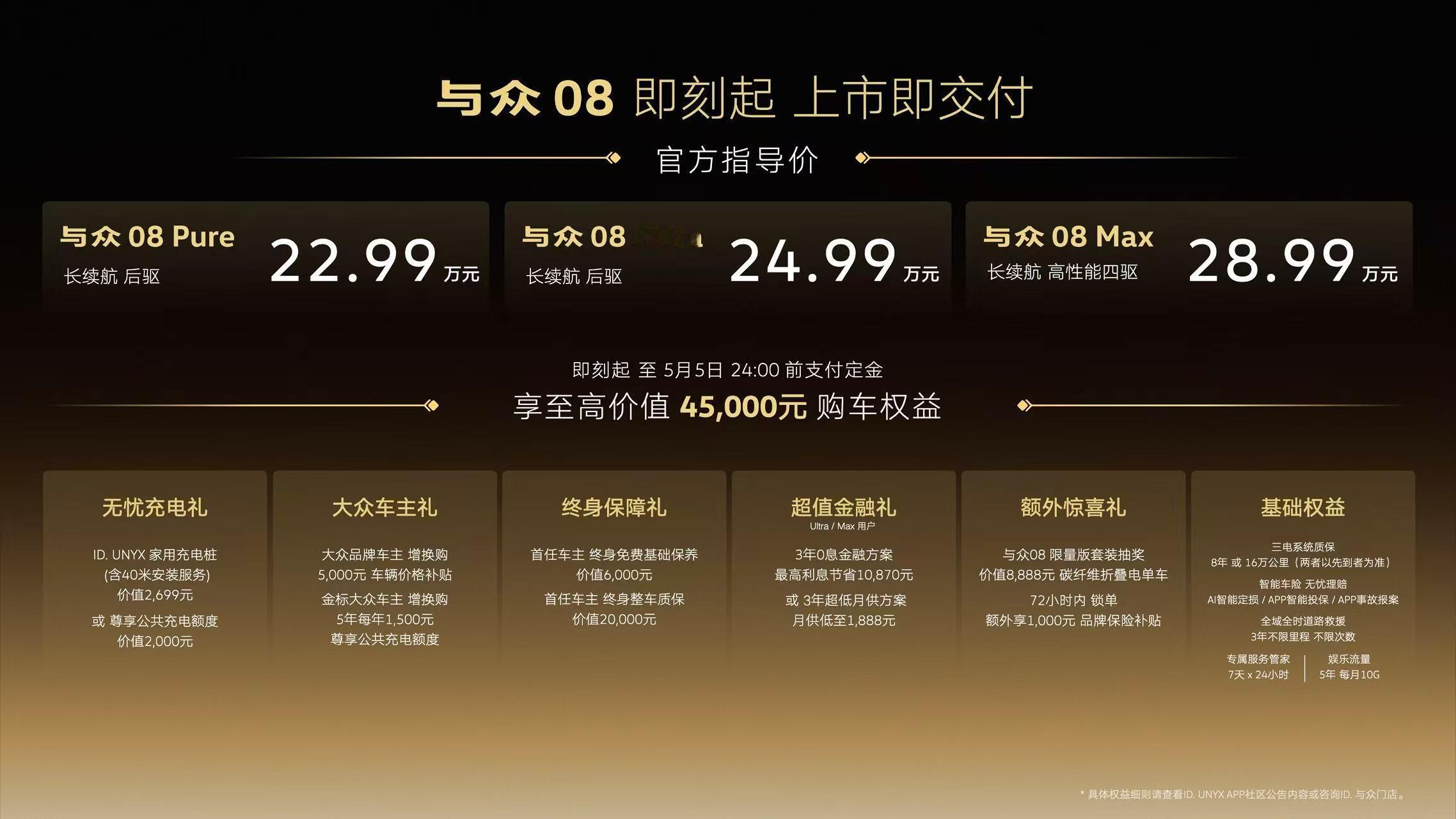 【售价22.99万元起,大众安徽与众08正式上市】4月16日,大众安徽与众08正式上市,共推出3款车型,售价区间为22.99万-28.99万元,该车型将亮相2026北京车展。新车采用全新设计语言,配备水晶镭雕交互车灯与贯穿式金色饰条,内饰95%软包覆盖。车身尺寸方面,其长宽高分别为5000/1954/1688mm(空悬默认位置1672mm),轴距3030mm。智能化层面,车辆搭载由小鹏汽车赋能的智能辅助驾驶系统,配备双图灵芯片与26颗高精度感知硬件,支持高速及城市NOA功能,座舱搭载骁龙8295P芯片与三联屏交互系统,接入双重AI大模型实现多模态语音交互。动力方面,新车全系搭载800V超快充系统与宁德时代电池,CLTC续航最高730公里,底盘配备双腔空气悬架、DCC自适应调节及AI智能底盘,同时新增晕动舒缓模式。