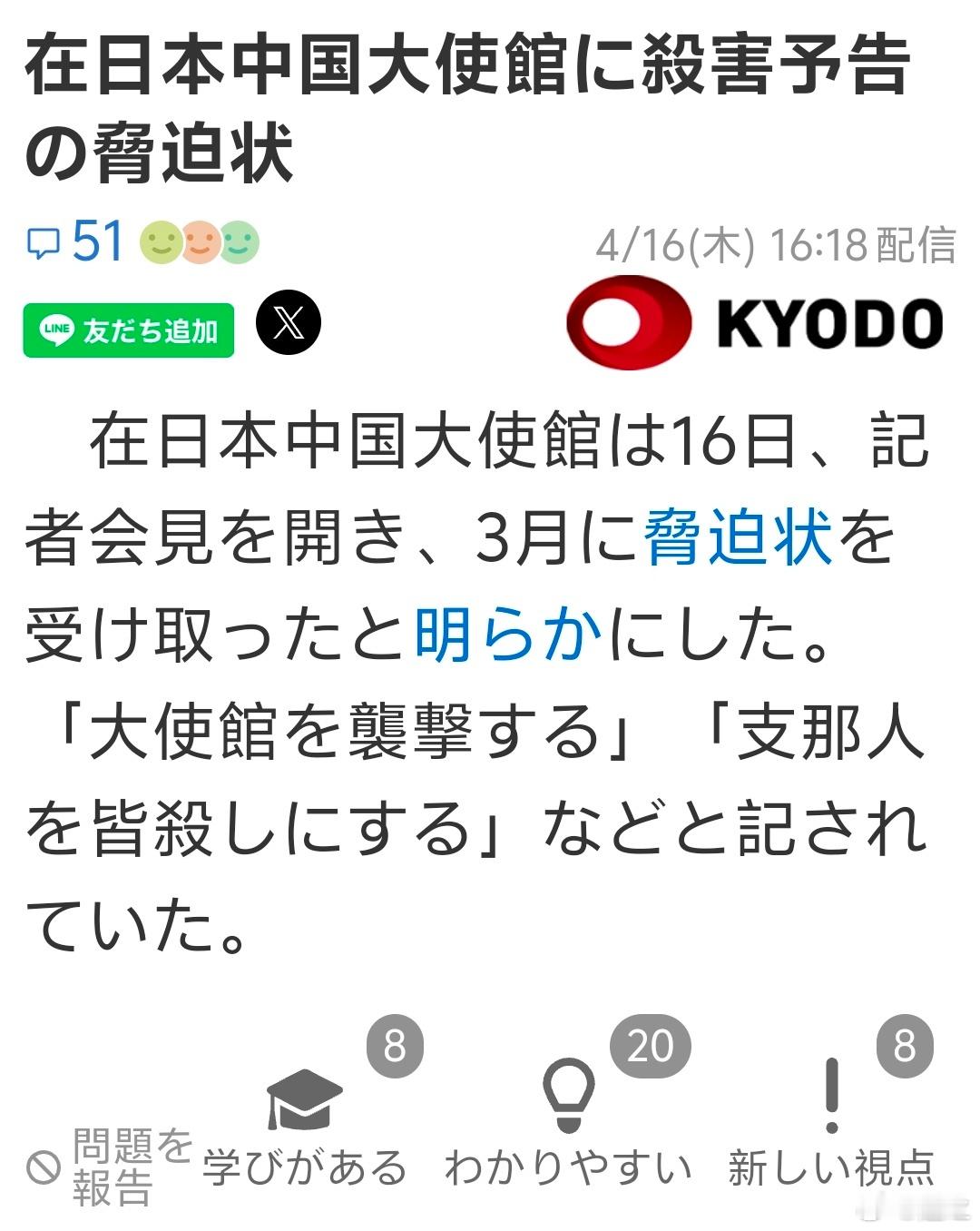 中国驻日大使馆接连遭到恐怖威胁日本共同社报道说,驻日本中国大使馆于4月16日召开记者招待会,公开了3月大使馆收到的恐吓信。上面写着将会“袭击大使馆”、“杀死所有xx人”等。显然,日本军国主义幽灵不散。日本自卫队军人怀揣利刃闯入中国大使馆不是一个孤立的事件。中国发布会上介绍和强调了:自称由日本前警察和前自卫队队员组成的组织。但是日本共同社对国内第一次报道的时候,故意把这部分漏了,降低事件的关联性。这和日本自民党请自卫队歌姬穿着军服一起唱军之代一样,都是极为严重的挑衅。日本官方长官木原已经对自民党大会请自卫队女歌手去唱歌表示了反省。