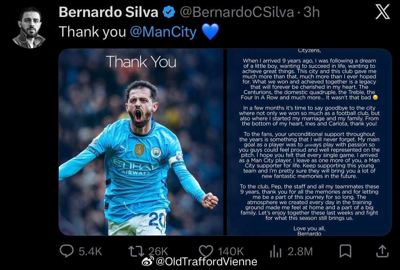 B席尔瓦官宣赛季结束离开曼城9年,不短。