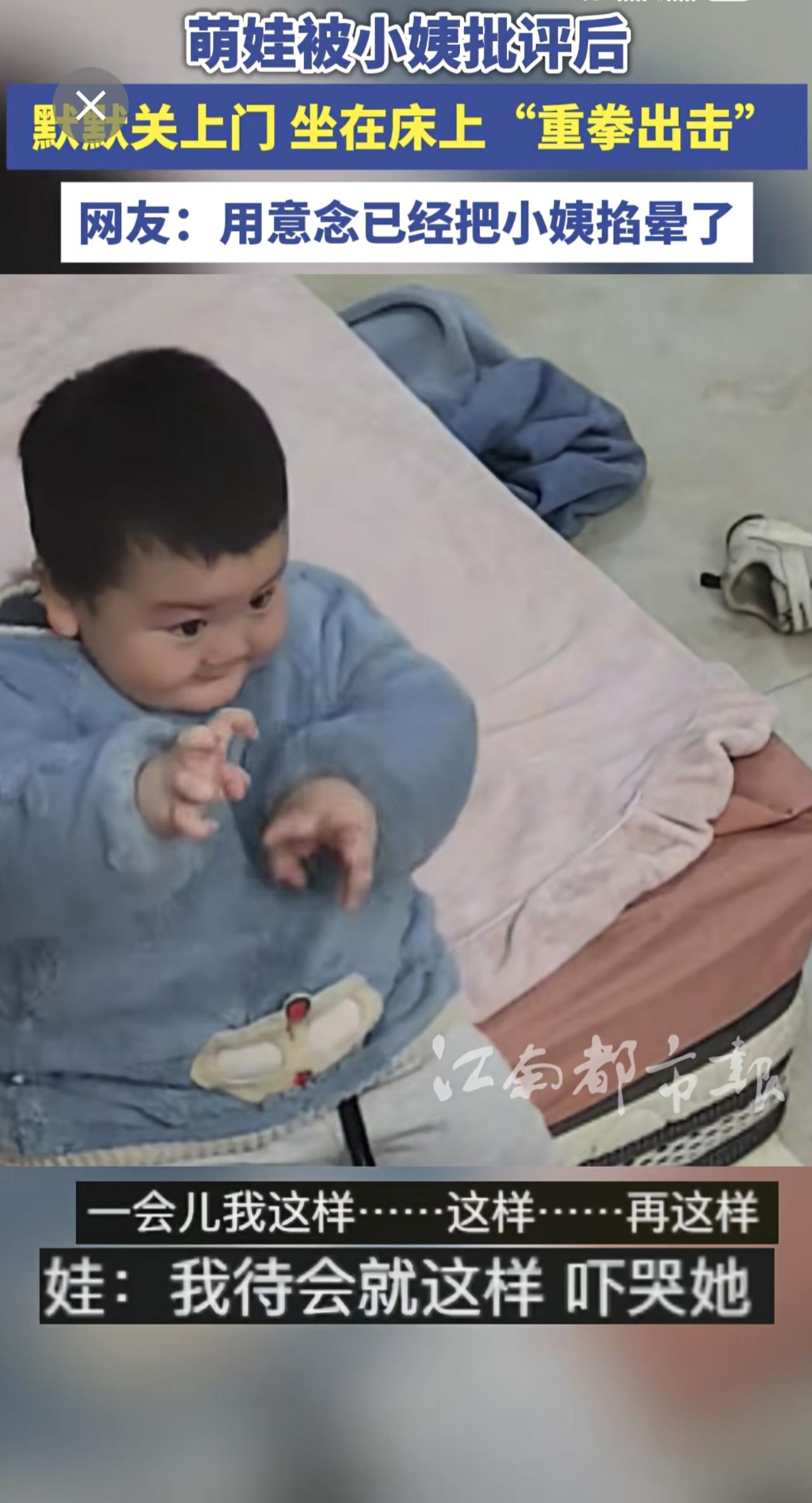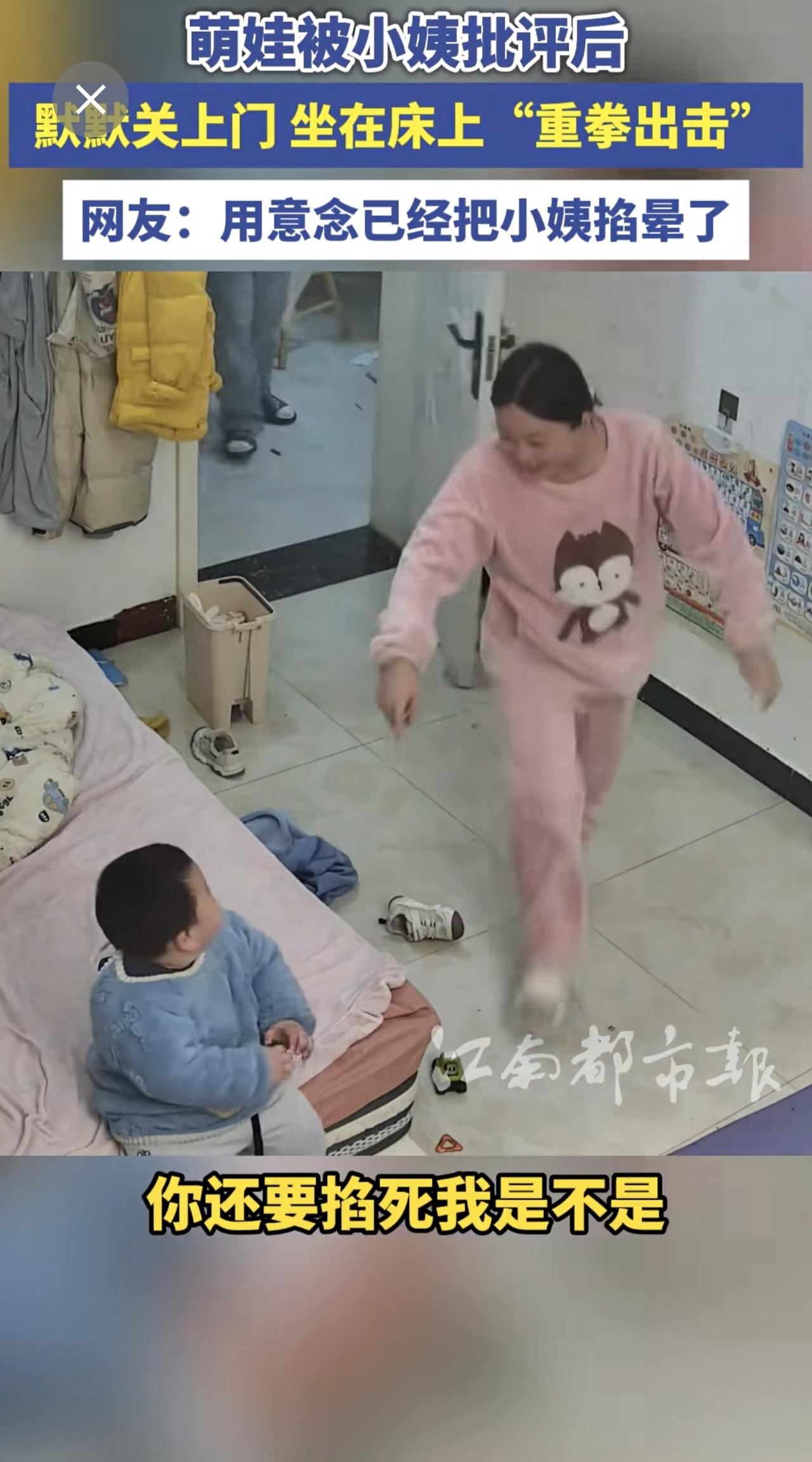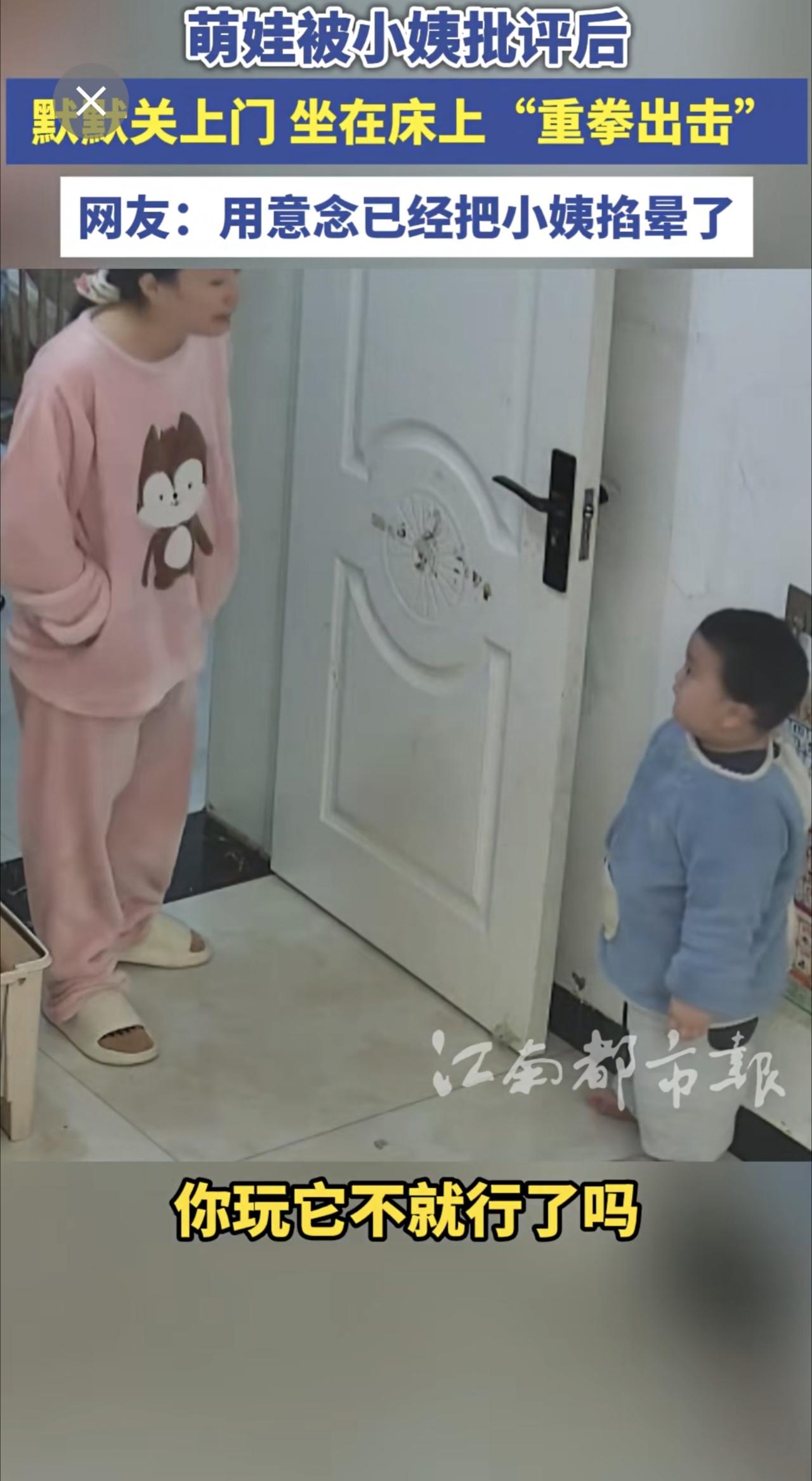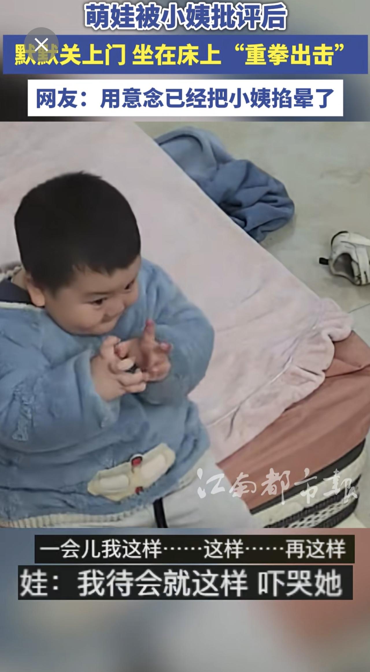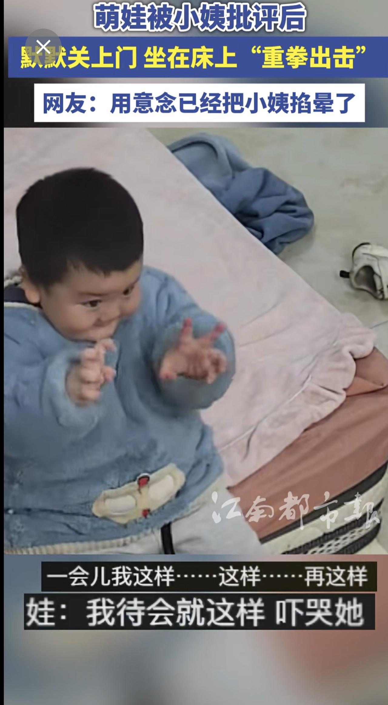 萌娃被小姨批评后,默默关上门,坐在床上“重拳出击”。网友:用意念已经把小姨掐晕了!还有这种操作 萌宝