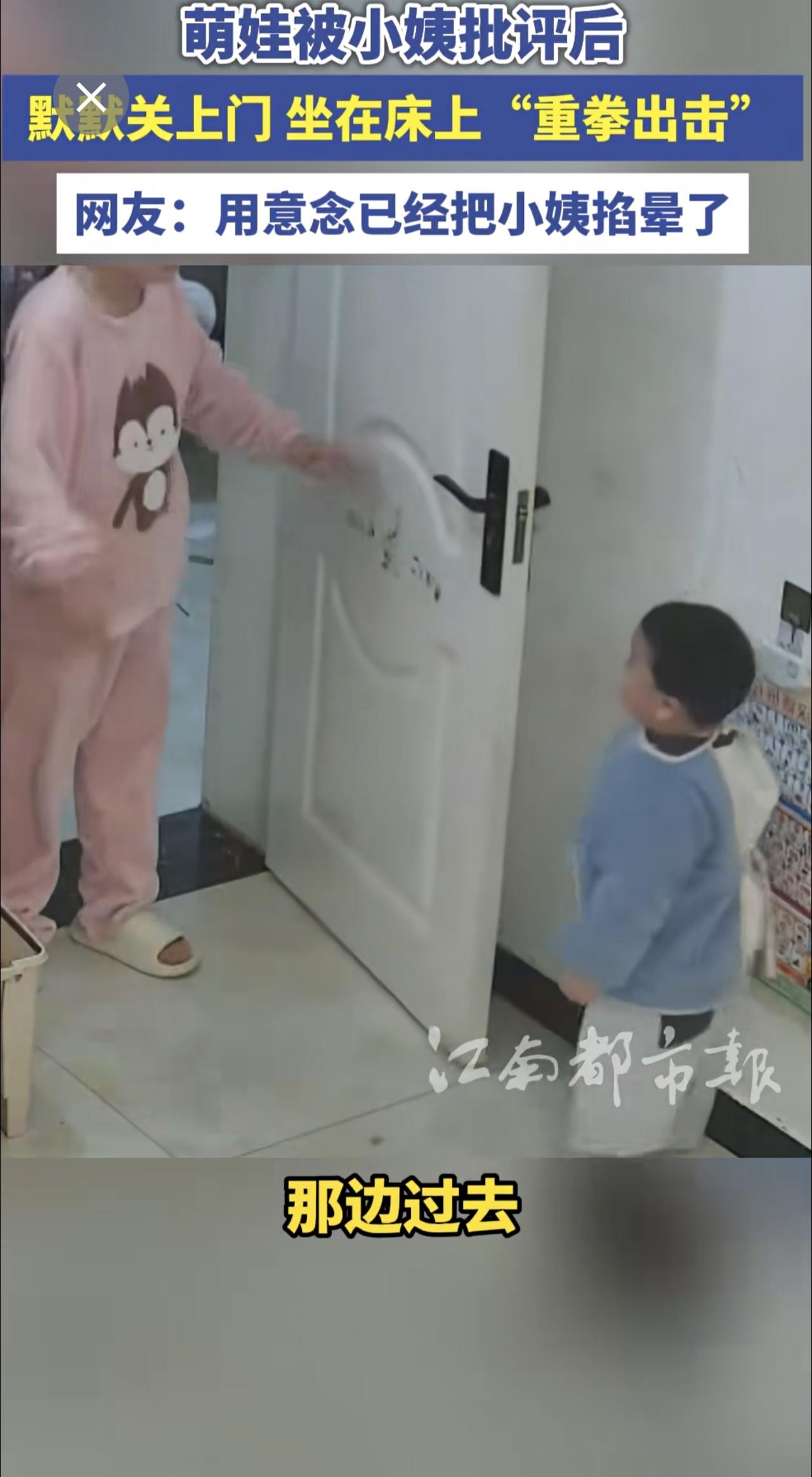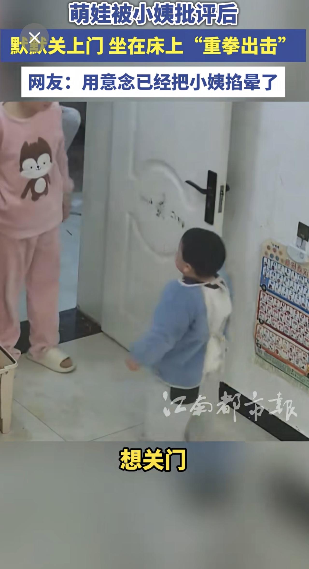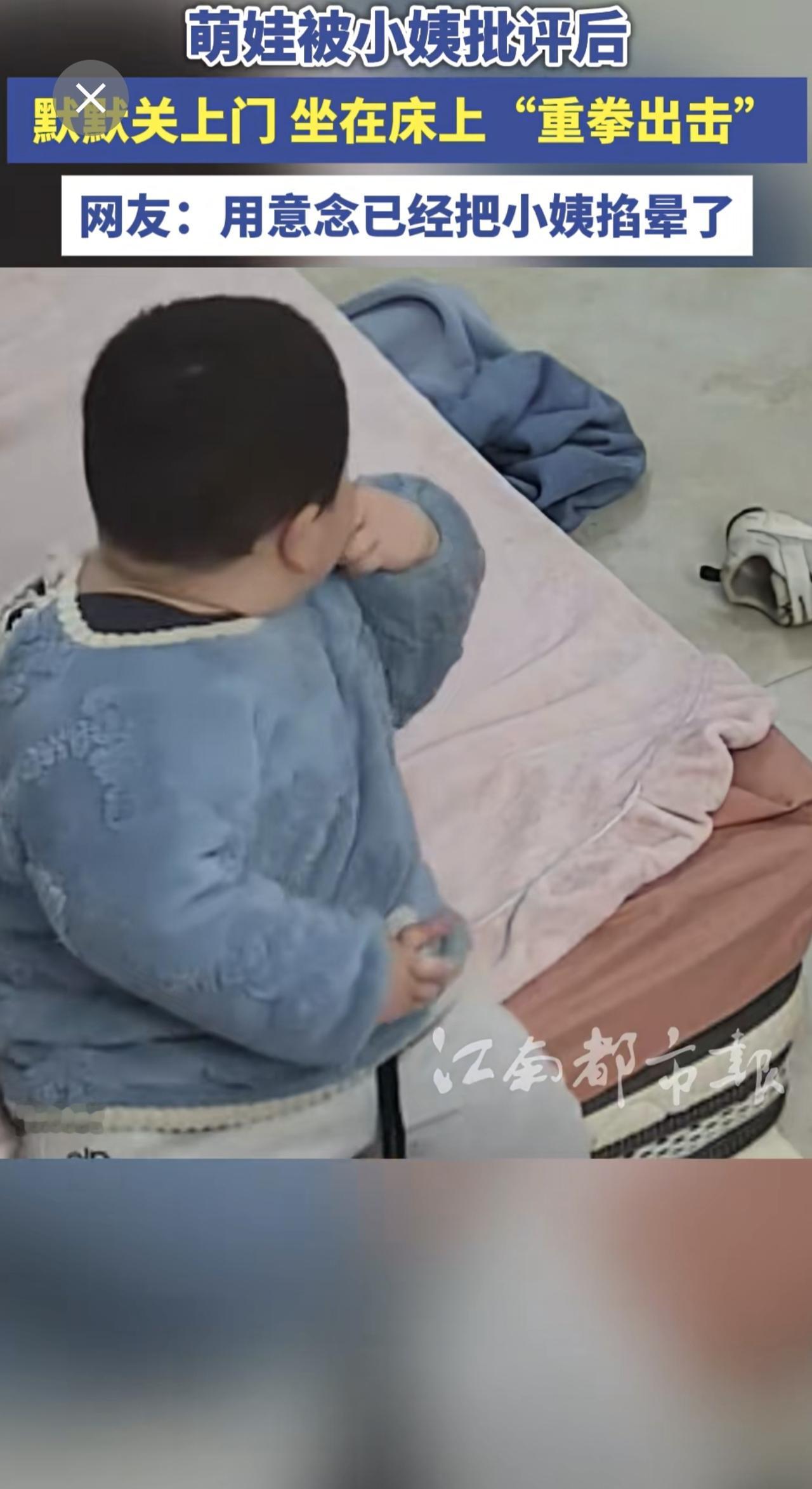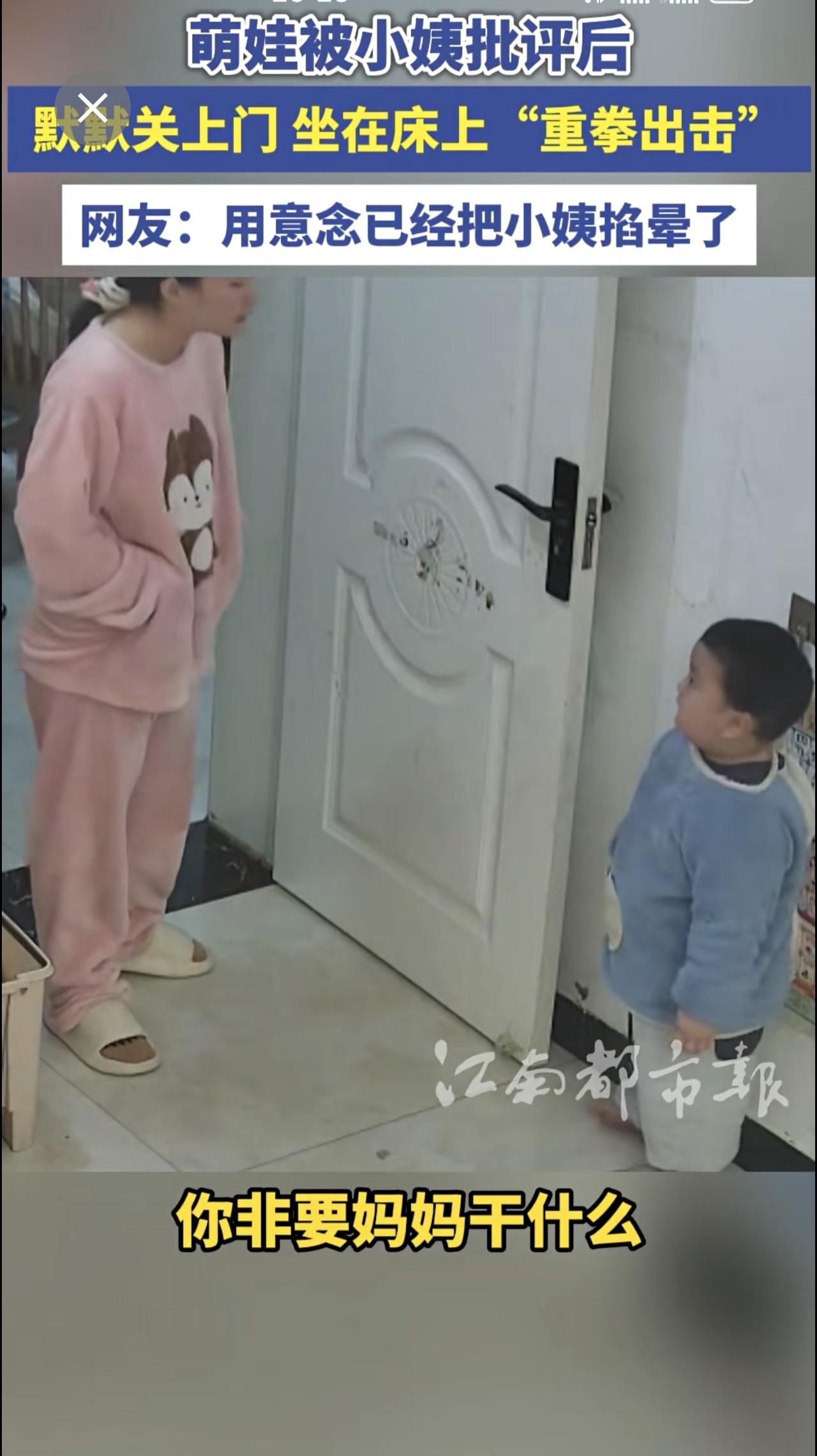萌娃被小姨批评后,默默关上门,坐在床上“重拳出击”。网友:用意念已经把小姨掐晕了!还有这种操作 萌宝