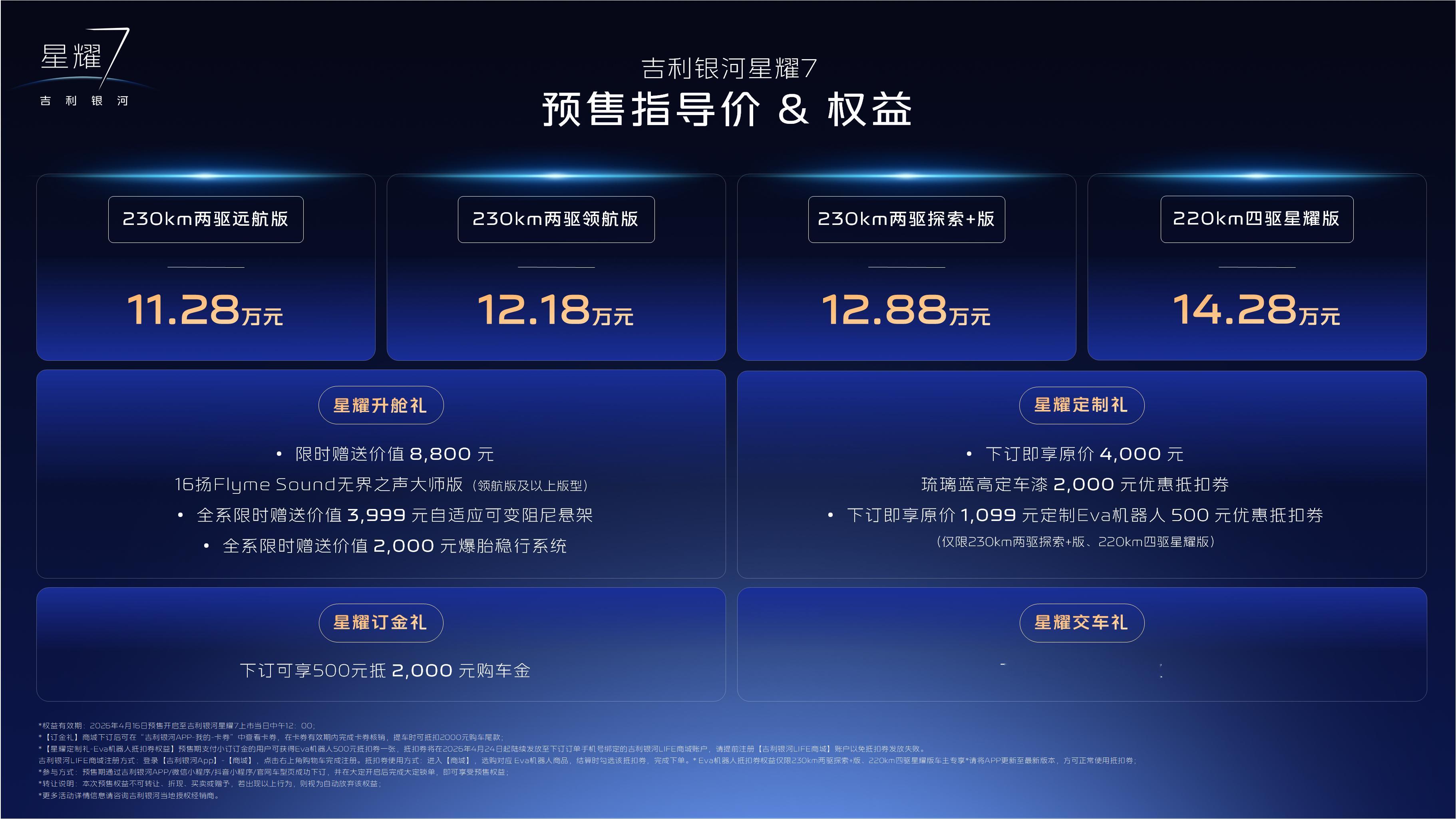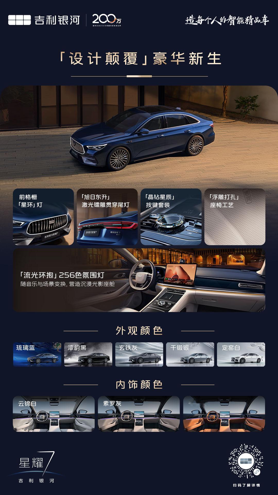 中级豪华轿车市场卷了这么多年,终于等来一个既要又要还要的全能王者。银河星耀7预售价11.28万起,中级豪华电混轿车配置天花板,价值满配让豪华触手可及!颜值是媲美百万豪车的排面,动力是5.4s四驱的性能,油耗是2L级的勤俭持家,还有千里浩瀚辅助驾驶H3方案帮你跑长途。全维度满足,不用你做取舍。再加上四重权益,这波吉利银河星耀7是真的拿出了诚意。吉利银河星耀7预售价11.28万元起