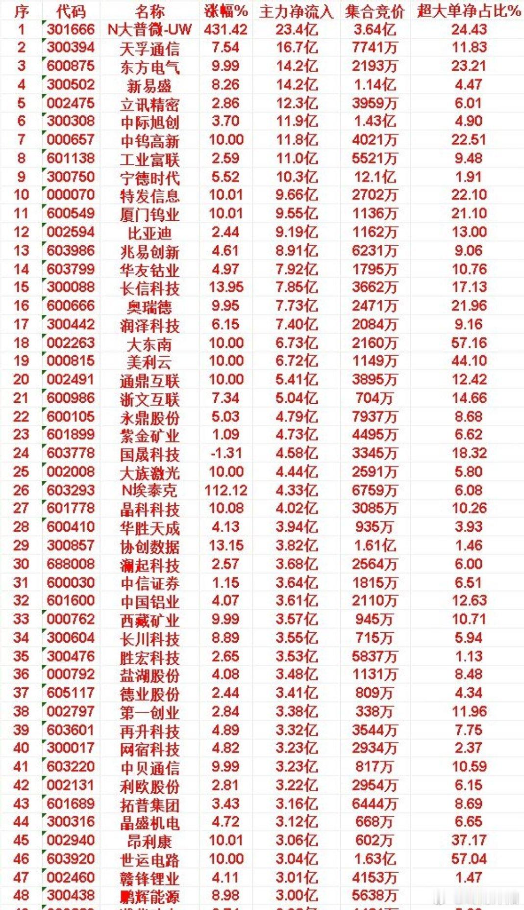 4月16日收盘主力资金动向主力资金大幅流出个股北方稀土主力净流出14.7亿元,超大单流出31.3亿元;阳光电源净流出9.15亿元,超大单流出23.3亿元;特变电工净流出7.30亿元,超大单流出13.7亿元;中国西电净流出7.05亿元,超大单流出11.0亿元;药明康德净流出6.37亿元,超大单流出11.3亿元;芯原股份净流出6.34亿元,超大单流出38.8亿元。主力资金大幅流入个股- 301666 N大普微-UW:涨幅431.42%,净流入23.4亿元- 300394 天孚通信:涨幅7.54%,净流入16.7亿元- 600875 东方电气:涨幅9.99%,净流入14.2亿元- 300502 新易盛:涨幅8.26%,净流入14.2亿元- 002475 立讯精密:涨幅2.86%,净流入12.3亿元- 300308 中际旭创:涨幅3.70%,净流入11.9亿元- 000657 中钨高新:涨幅10.00%,净流入11.8亿元- 601138 工业富联:涨幅2.59%,净流入11.0亿元- 300750 宁德时代:涨幅5.52%,净流入10.3亿元- 000070 特发信息:涨幅10.01%,净流入9.66亿元