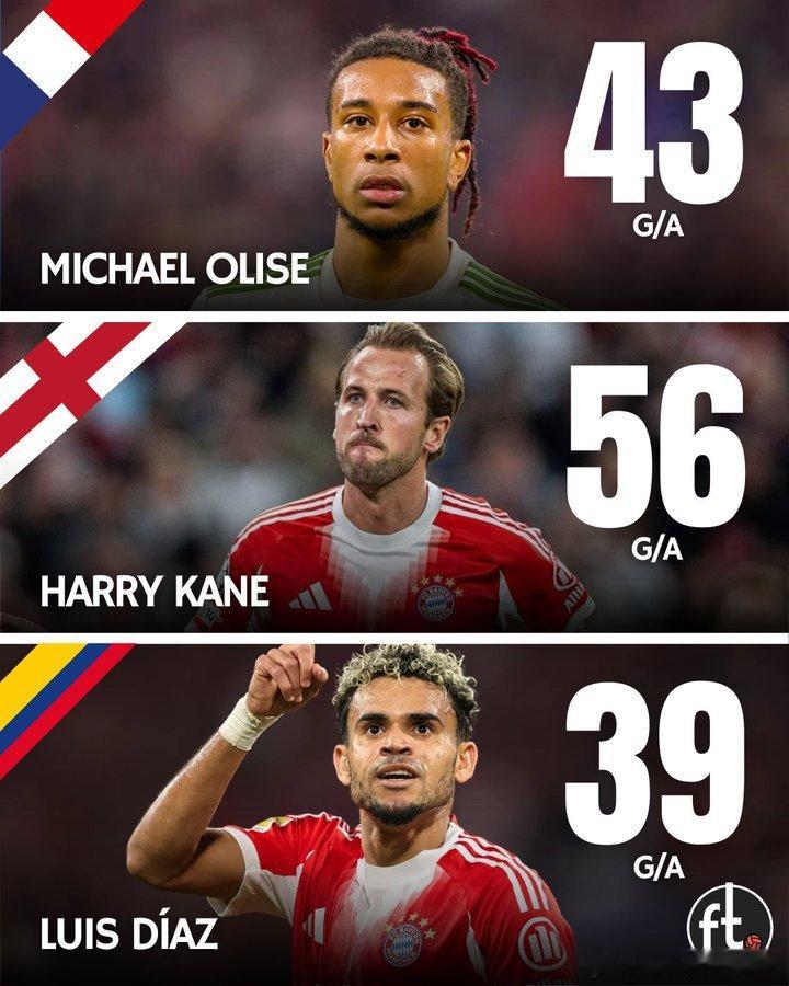 ▪️ 奥利塞:43场18球25助▪️ 凯恩:42场50球6助▪️ 迪亚斯:42场24球15助