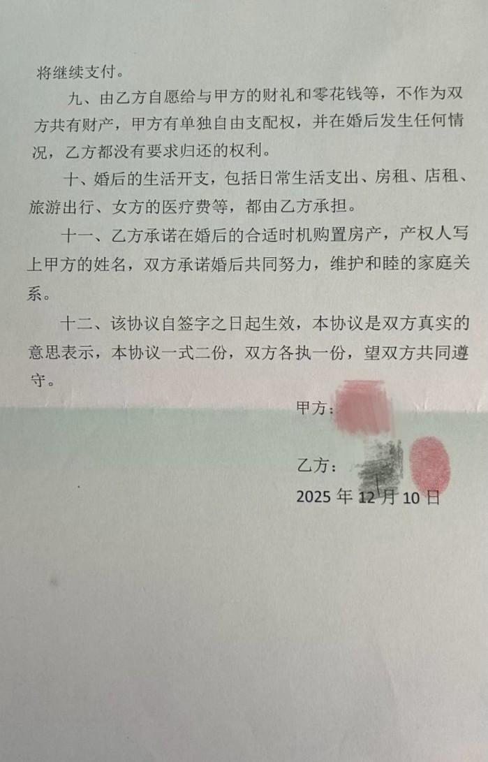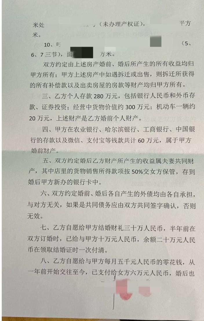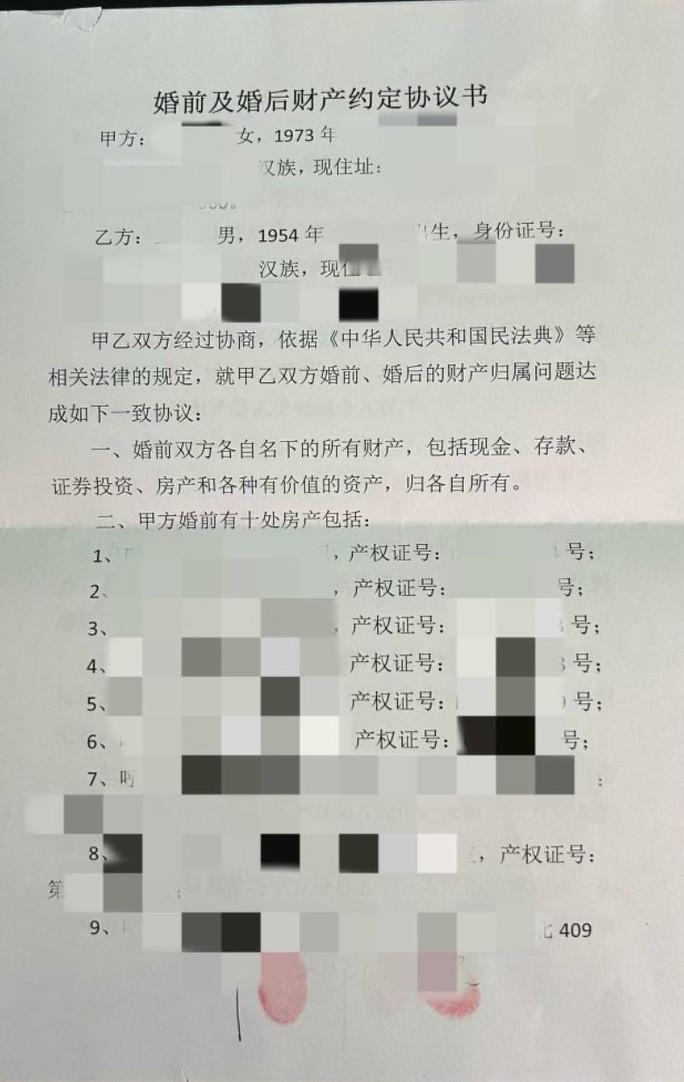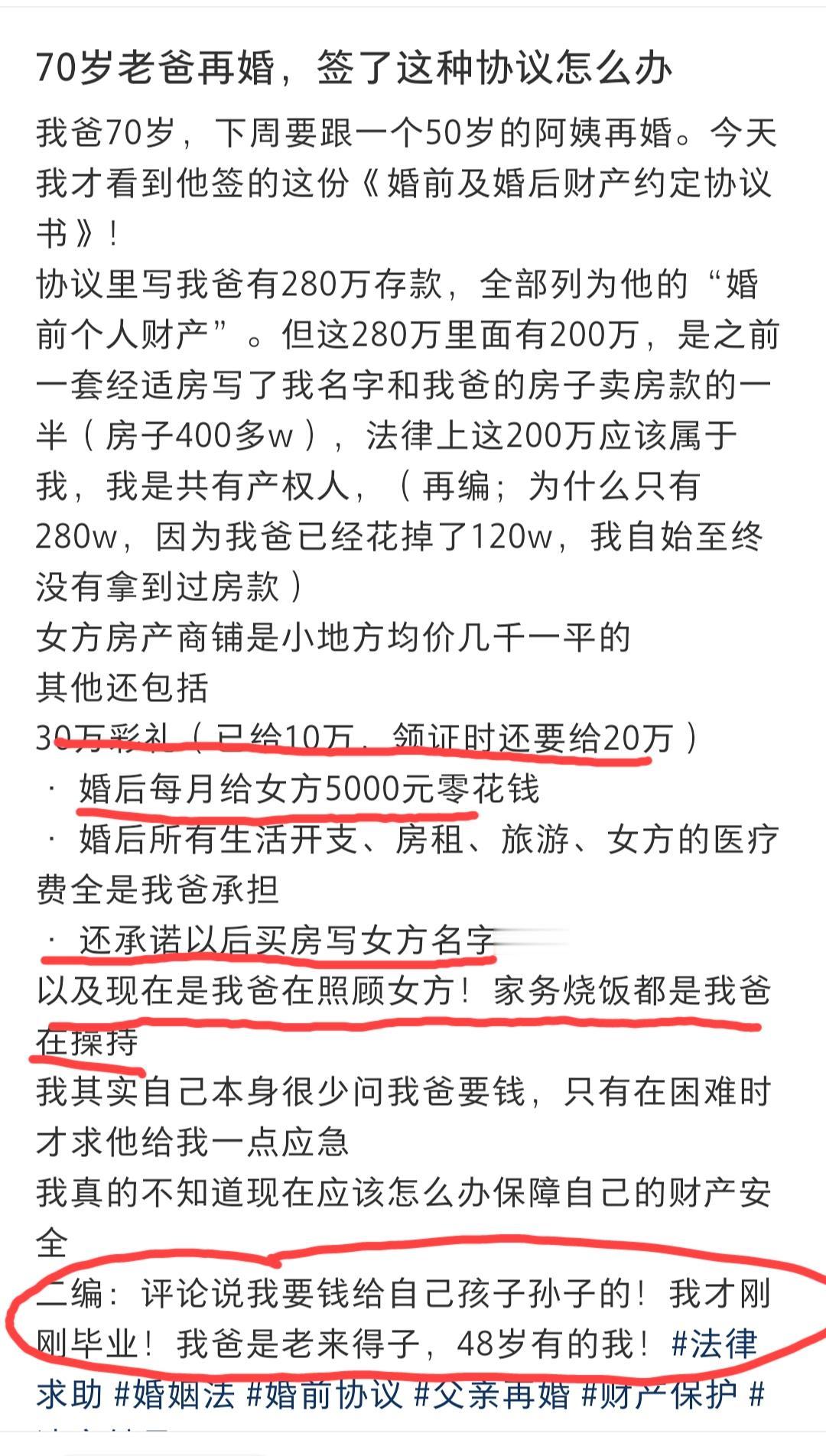 上海。这位22岁的女生发文吐槽:他70岁的老爸签了这么一份“婚前及婚后财产约定协议书”,他应该如何保障自己的财产安全? 大致看了这么一份协议,男子的老爸肯定是上海人,女的极大可能是哈尔滨人,年龄50岁,女的手里居然有多达10处的房产,女的存款还有60万。双方约定彩礼30万,男方已经给了10万了。婚后男的答应每月给女方5000元零花钱,其他家庭所有生活开支由男方负担等等。 目前,这个女生准备走诉讼流程,但是有转移财产的风险。 个人感觉:总感觉这个事情悬悬乎乎的,一个外地的50岁的女的,还是手握10套房产的富婆,看上了一个上海70岁的男的。如果是看中了他这个人,为什么婚后的所有开支都要男的承担。如果看中他的钱,可这个女的本身也有钱啊,要这么多钱干嘛,自己的钱又不花,带进棺材里面去啊? 评论区的网友们,这个事情上,你们是什么看法?