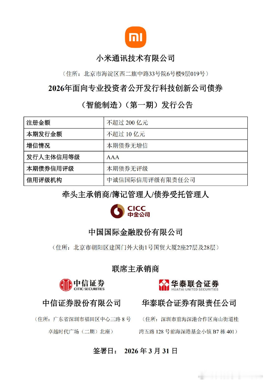 【小米发行10亿元科创债 】4月16日,小米通讯技术有限公司在上交所公告称,已于4月16日完成科技创新公司债券“26小米K1”的发行。本期实际发行规模为10亿元,最终票面利率为1.60%。 (财联社)