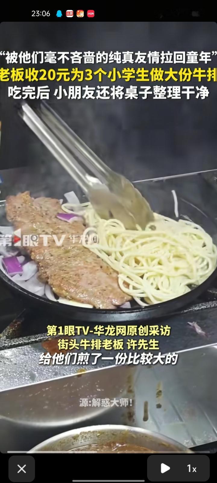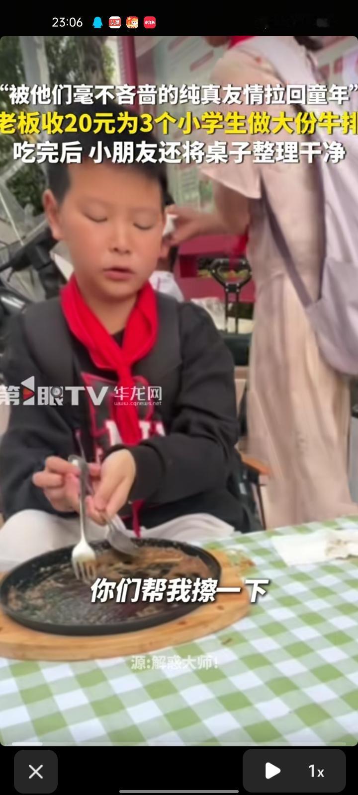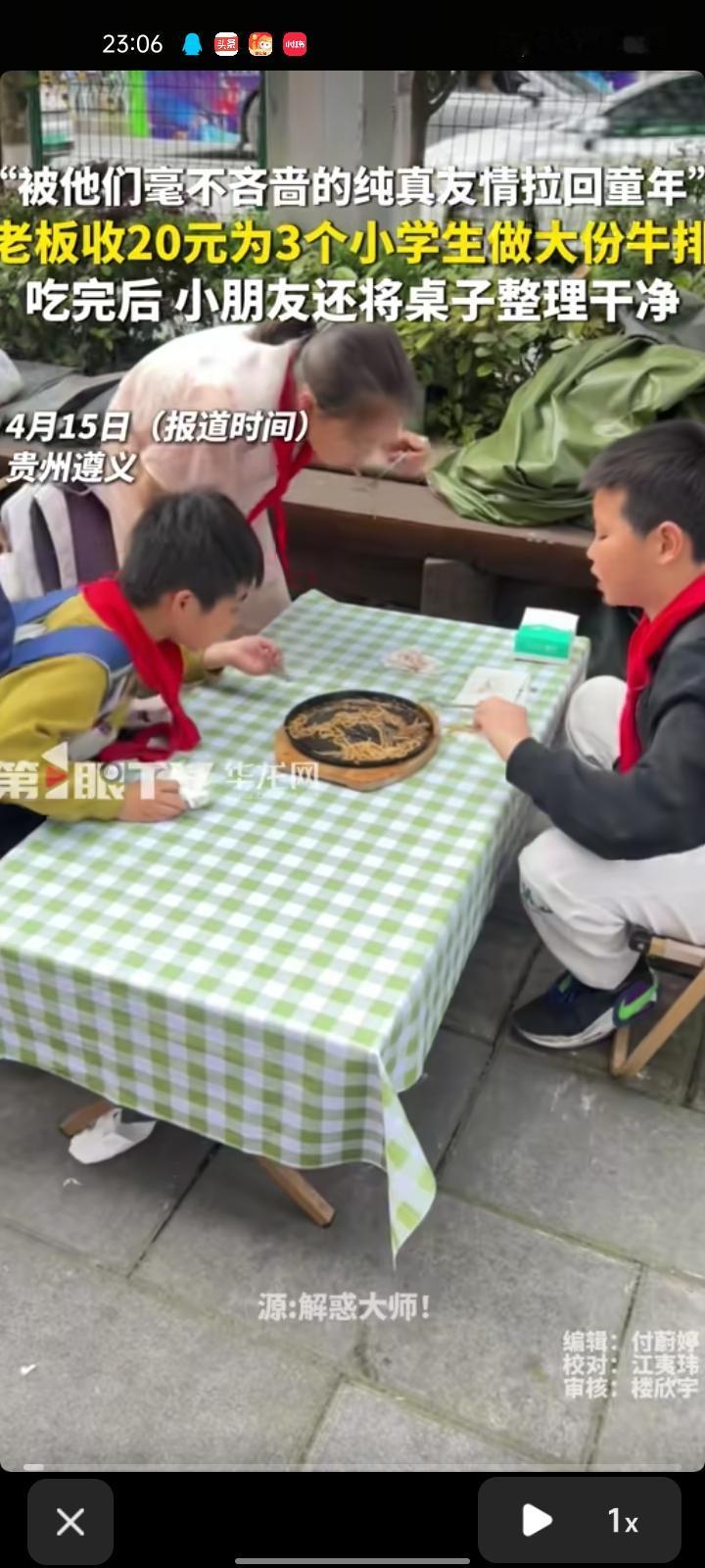 4月15日,遵义仁怀市。老板许先生称,自己是在街上卖牛排的,来了三个小学生,其中一个高个子学生有二十块钱,另外两个好像一人一块钱,但钱不够。因为卖的牛排是35元一份。看着他们想吃,就收二十块钱给他们煎一份比较大的。吃完后,他们还将桌子整理干净。看他们很童真的样子,就想起了小时候经常和同学买一包辣条分着吃,这种童年生活很快乐