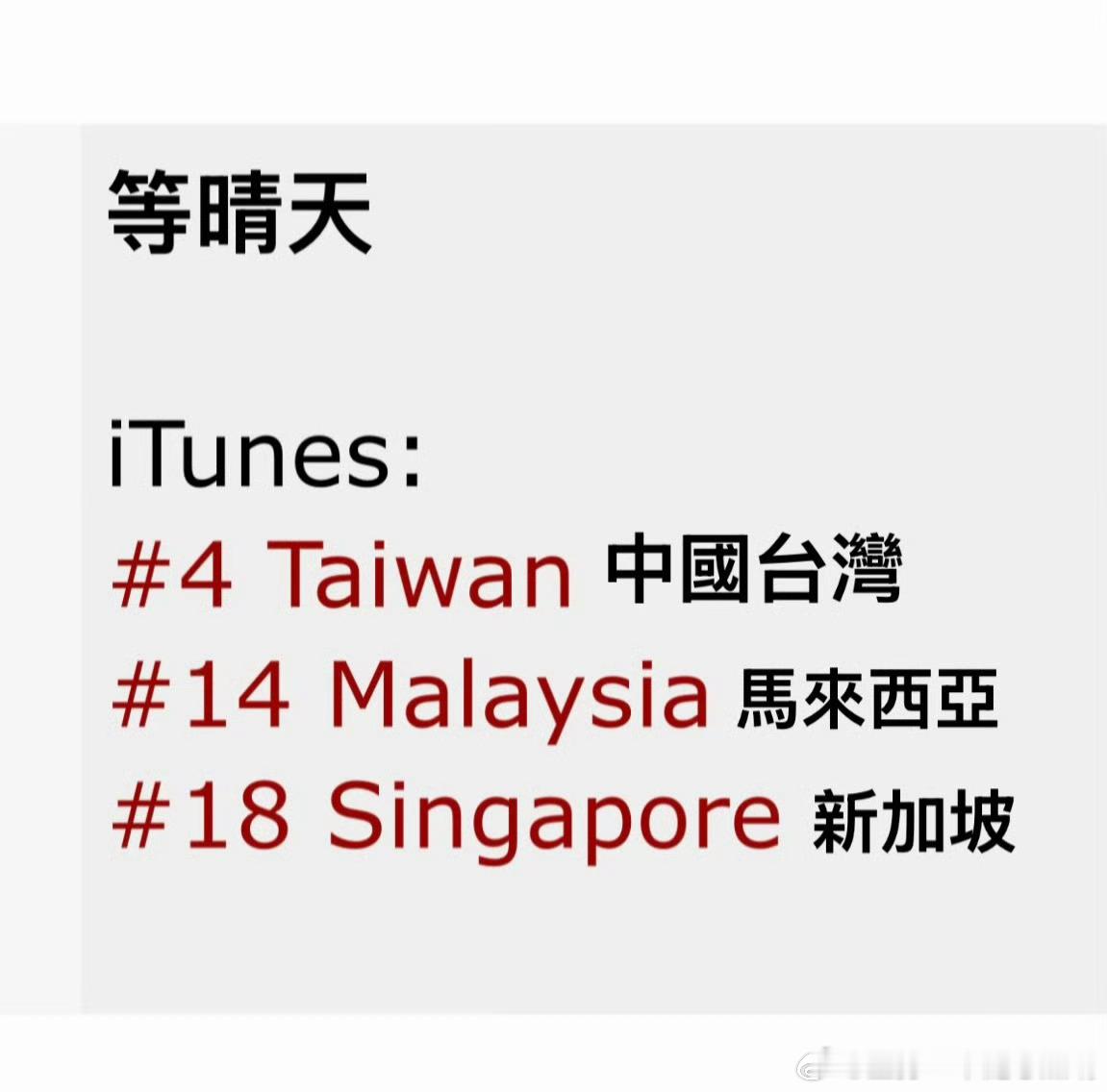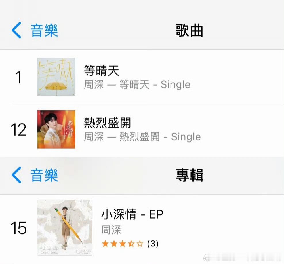 周深全新单曲等晴天荣誉:香港地区iTunes:热门热搜「周深」第一😨《等晴天》歌曲排名第一🔥宝岛、马来西亚、新加坡均上榜!