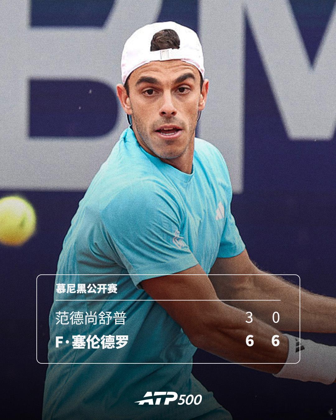 ATP500 慕尼黑公开赛第二轮,5号种子F·塞伦德罗以6-3 6-0横扫范德尚舒普,强势晋级八强,1/4决赛他将对阵兹维列夫与迪亚洛的胜者。