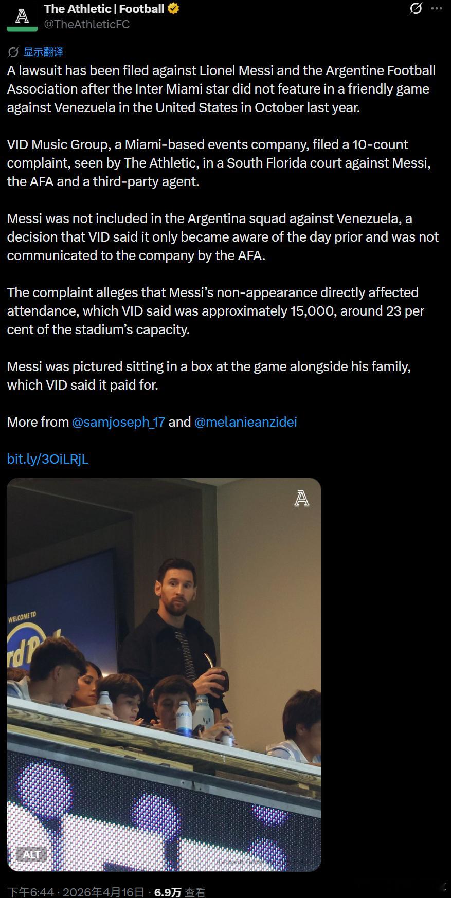 梅西并未进入阿根廷对阵委内瑞拉一役的比赛名单,而主办方 VID Music Group 表示,他们直到比赛前一天才得知这一决定,阿根廷足协此前并未就此作出任何沟通。诉状称,梅西的缺阵直接影响了上座率——现场观众仅约 15,000 人,约为球场容量的 23%。