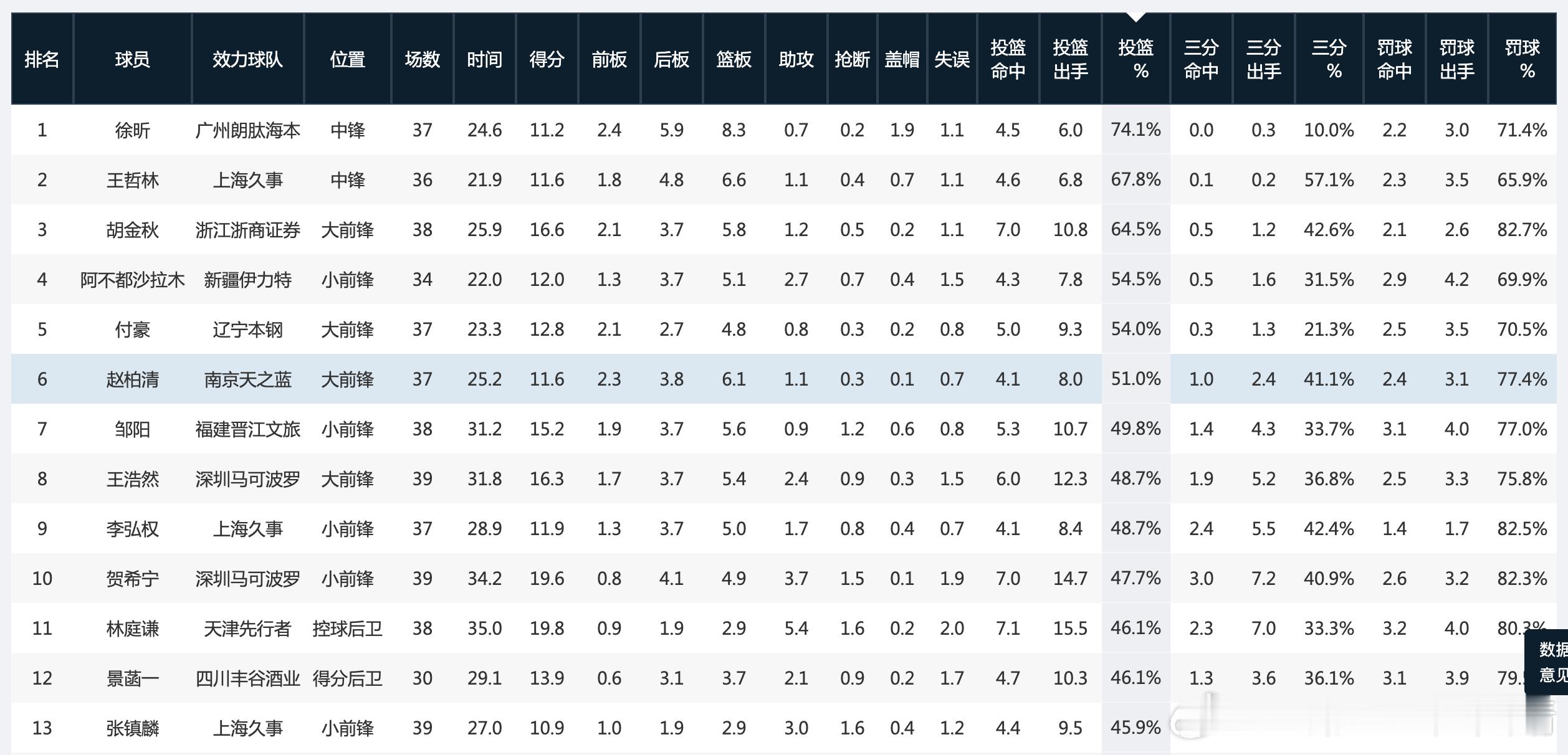 辽宁男篮付豪 所有球员的投篮命中率,付豪排名全联盟第5名。谁说付豪篮下终结不行?
