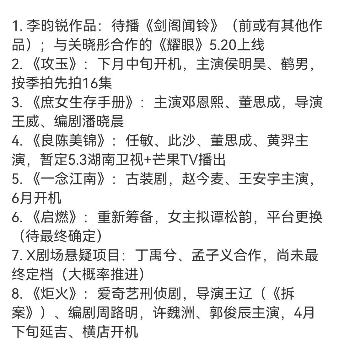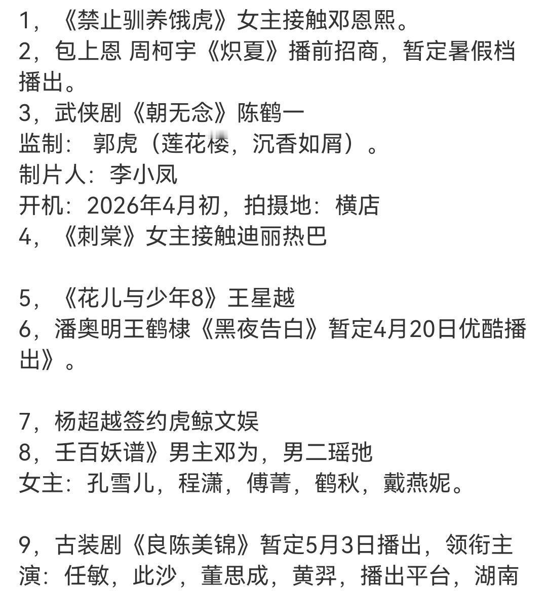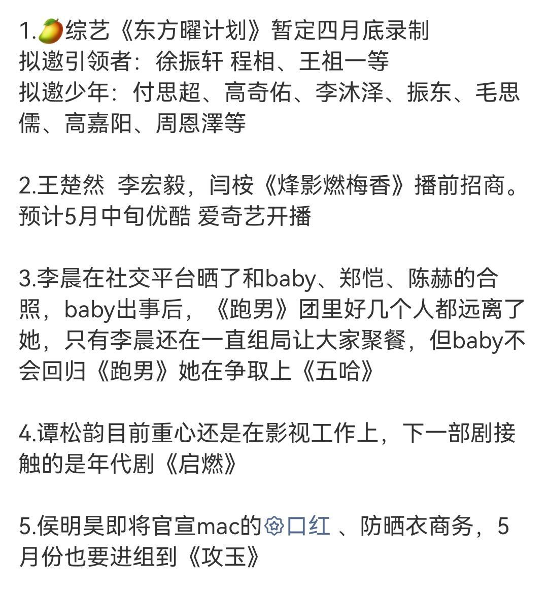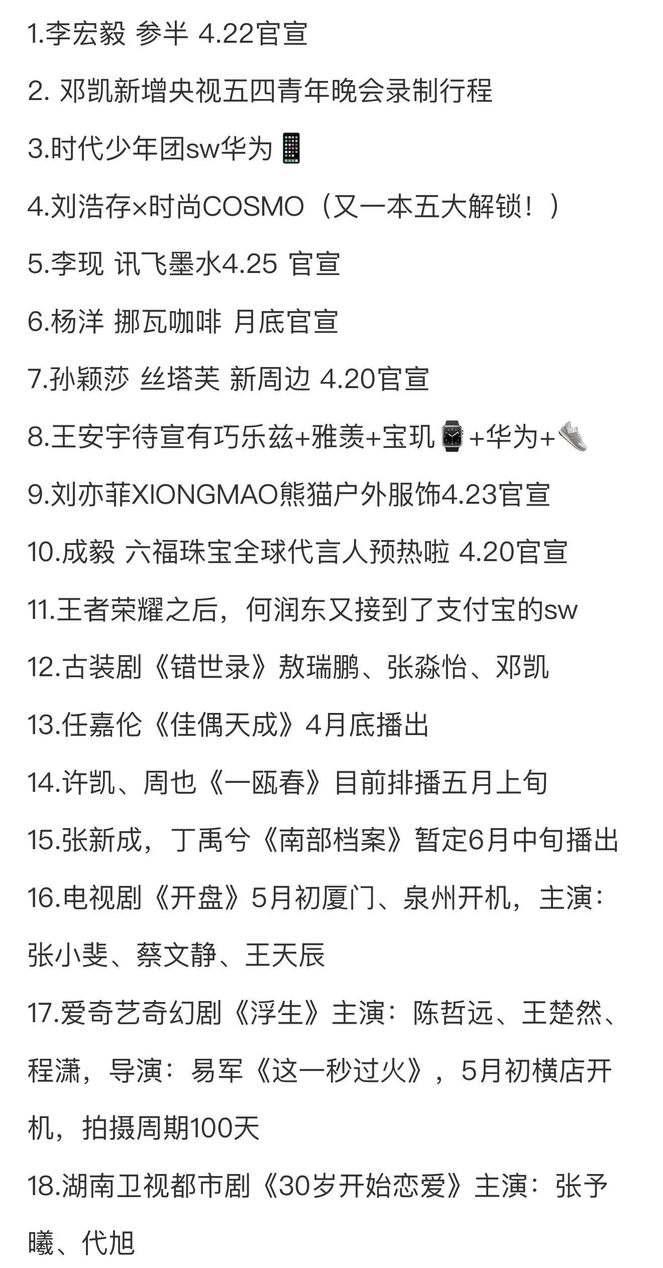 1.李宏毅 参半 4.22官宣2.邓凯新增央视五四青年晚会行程3.时代少年团sw华为📱4.刘浩存×时尚COSMO(又一本五大解锁!)5.李现 讯飞墨水4.25官宣6.杨洋 挪瓦咖啡 月底官宣7.孙颖莎 丝塔芙 新周边 4.20官宣8.王安宇待宣有巧乐兹+雅羡+宝玑⌚️+华为+👟9.刘亦菲XIONGMAO熊猫户外服饰4.23官宣10.成毅 六福珠宝全球代言人预热啦 4.20官宣11.王者荣耀之后,何润东又接到了支付宝的sw12.古装剧《错世录》敖瑞鹏、张淼怡、邓凯13.任嘉伦《佳偶天成》4月底播出14.许凯、周也《一瓯春》目前排播五月上旬15.张新成,丁禹兮《南部档案》暂定6月中旬播出16.电视剧《开盘》5月初厦门、泉州开机,主演:张小斐、蔡文静、王天辰17.爱奇艺奇幻剧《浮生》主演:陈哲远、王楚然、程潇,导演:易军《这一秒过火》,5月初横店开机,拍摄周期100天18.湖南卫视都市剧《30岁开始恋爱》主演:张予曦、代旭