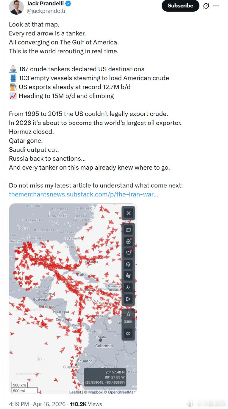 每一个红色箭头都是一艘油轮。它们全部正在汇聚到所谓的“美国湾”。