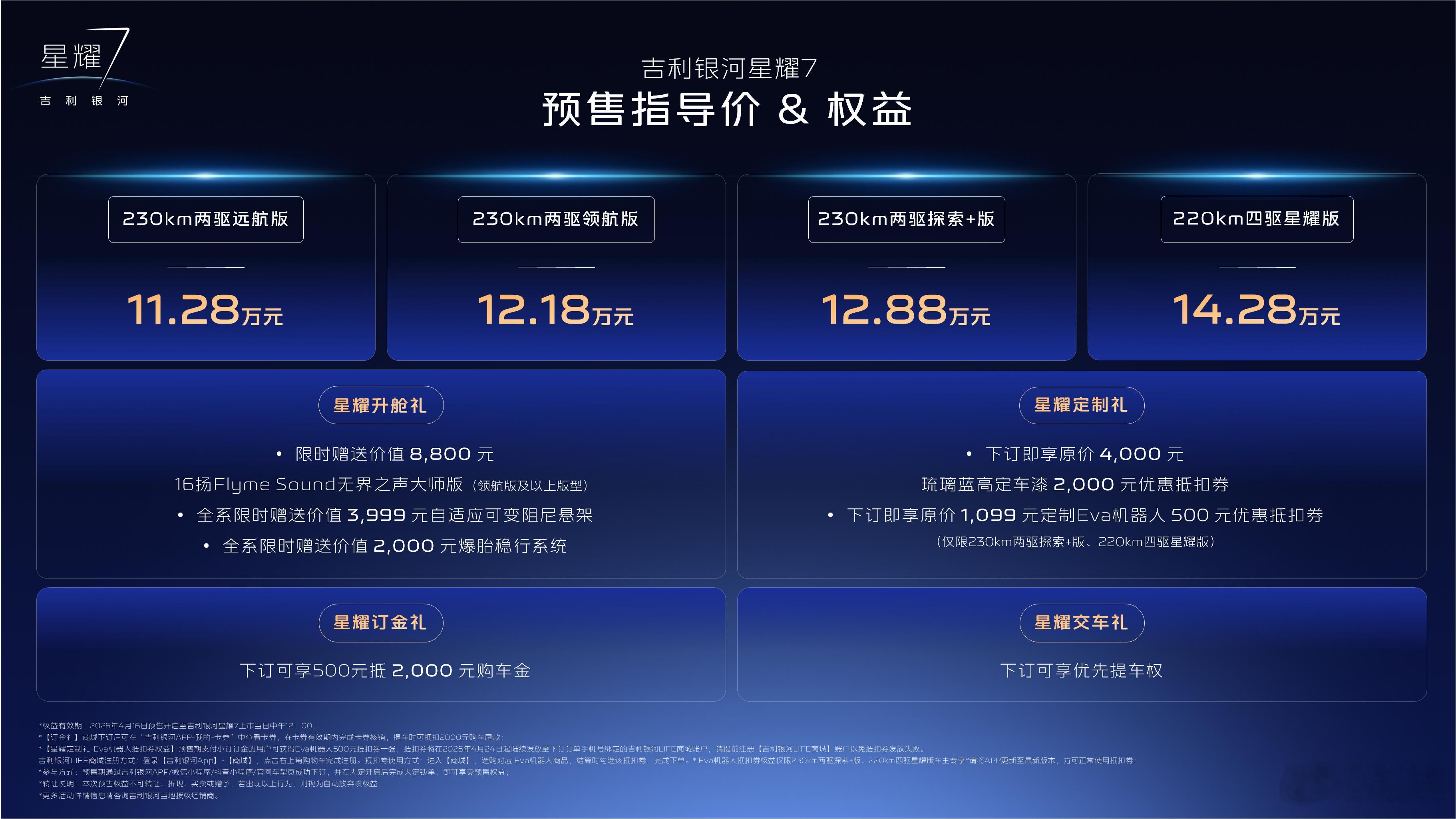 吉利银河星耀7的预售价来了,4个车款,预售价为11.28-14.28万元。