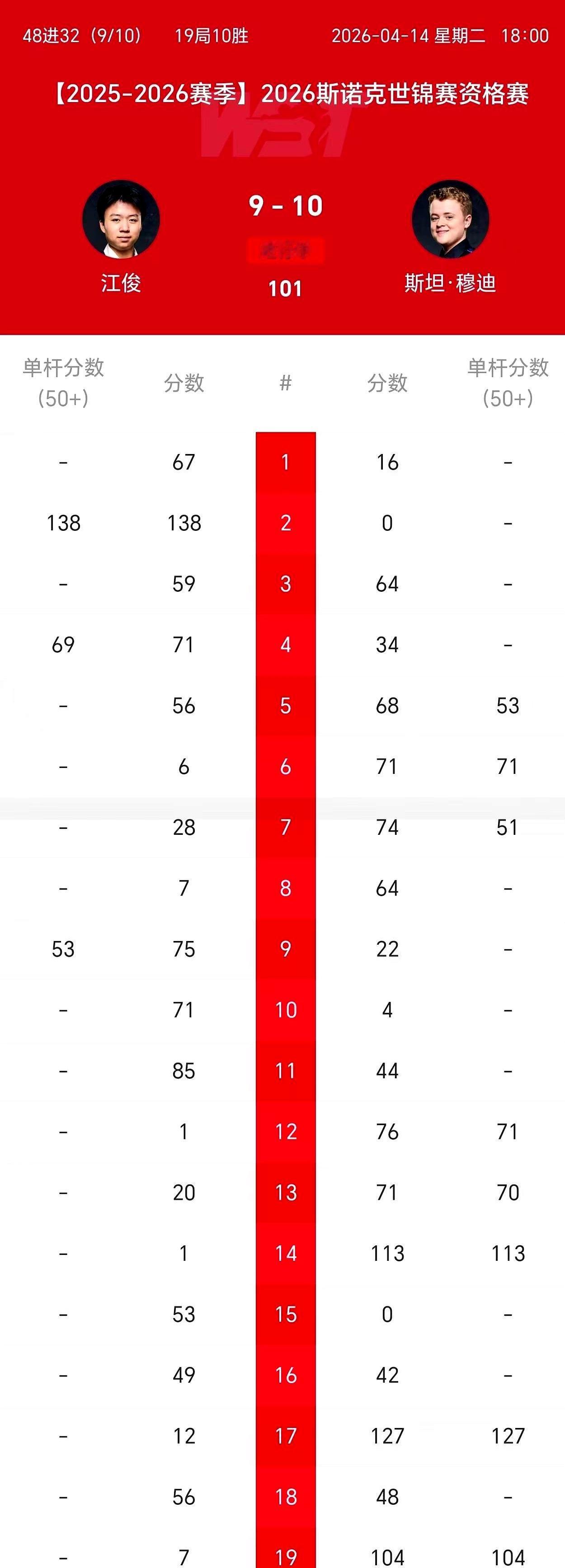 中国小将江俊世锦赛资格赛止步,决胜局最后一颗黑球失误,太可惜了!从大比分落后追到9-9平,这顽强劲儿真棒。 决胜局对手穆迪都领先71分了,台面没几颗球,江俊硬是打出单杆66分,清台到黑球,就差那么一丁点。结果黑球撞袋口弹出,穆迪直接单杆104分绝杀。 这小伙子潜力是有的,之前苏格兰、威尔士赛都打进过八强甚至四强。但这场比赛,白球控制和力量调控问题太明显了,全场好几次自己把白球打进袋。 第三局对手状态不好,他还是因为简单中袋失误被逆转。这种基本功问题不解决,未来想站稳脚跟,难度有点大啊。 希望江俊能吸取教训,下次再来!