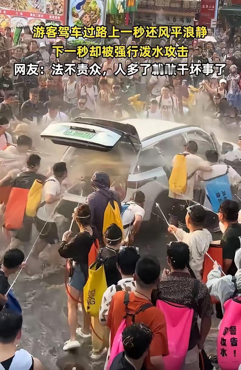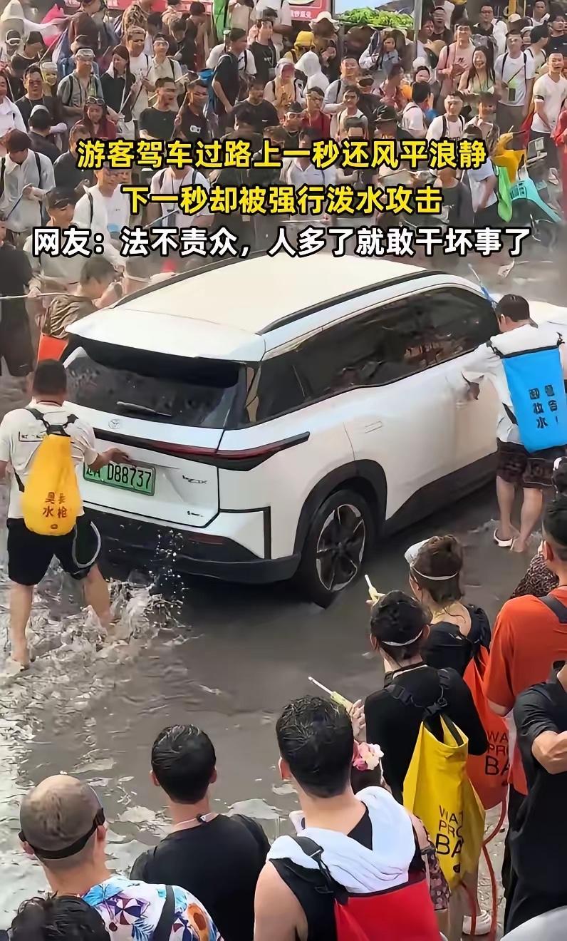 这样的泼水节已经变味了!云南泼水节,一辆辽A的白色新能源车路过,前一秒大家还只是往车上呲水,下一秒画风突变,几名男子竟然直接把车子车门和后备箱打开,随后强行泼水攻击,网友怒了:这泡水了算谁的? 4月14日,云南西双版纳景洪市的泼水节现场,一辆悬挂辽A牌照的白色新能源SUV,经历了一场彻底失控的“祝福”。 这哪是泼水节,这分明是“泼水劫”! 咱们先看几个扎心的细节。 车主一家是从辽宁自驾几千公里来的,车后排坐着60多岁的老父母,其中父亲还患有脑血栓。人家大老远来,图的是个“吉祥”,想感受一下傣族新年的热闹。 结果呢?热闹没看成,差点把命搭上。 视频里看得清清楚楚,车开得慢,被人团团围住。几个壮汉上去就是一顿生拉硬拽,车门开了,后备箱也弹了。紧接着,高压水枪顶着脸喷,水桶对着车里灌。 车里的女士想关门,外面的人死死拽着不让关。 最恐怖的一幕发生了:大量水涌进车内,没过多久,中控台、无线充电的位置开始冒烟。 那是电路短路的前兆啊! 新能源车最怕什么?怕水!电池包、电机、电控,哪一个不是精密部件?这一通猛灌,轻则电子元件报废,重则车辆自燃。这要是真着起火来,这一家子老小,往哪儿跑? 这已经不是“祝福”了,这是“谋杀”。 这事儿一出,网上吵翻了天。有人说:“过节嘛,玩嗨了,至于上纲上线吗?” 至于,太至于了。 泼水节的本意,是洗去尘埃,祈求吉祥。那是“清水泼洒”,是“相互祝福”。 可现在呢?高压水枪、水气球、甚至是带有攻击性的泼水,这哪里是过节,这是发泄。 更让人恶心的是那种“法不责众”的流氓逻辑。 你看那帮动手的,一个个觉得自己是在狂欢,是在传递快乐。他们把别人的痛苦当成自己的乐子,把别人的财产当成发泄的工具。 那个强行拉开车门的蓝包男子,被网友扒出来是个惯犯,路过的好几辆车都被他拉过。这哪里是“玩嗨了”,这分明就是借着节日的名义,在光天化日之下耍流氓。 律师说了,这涉嫌故意毁坏财物罪。 如果车辆定损超过5000元,这就不是赔钱的事儿了,是要坐牢的。如果造成人员受伤,还得算上故意伤害。 别拿“民俗”当挡箭牌。 真正的民俗,是有边界的。你想泼水,找愿意跟你泼的人泼。人家坐在车里,那是私人空间,那是人家的“移动堡垒”。你强行破门而入,往人家家里灌水,这在任何文化里,都叫“入侵”。 这事儿最让人寒心的,是那种“排外”的恶意。 车主是辽宁的,外地牌照。在很多旅游城市,外地车就是“肥羊”,就是“靶子”。 你看那帮人,专门挑外地车下手,专门挑好欺负的下手。那两个骑电动车的女生,摆手说不要,还是被追着喷。那个网红博主,被逼问“哪里人”,不说就一直滋水。 这哪里是热情好客?这是赤裸裸的霸凌。 西双版纳的文旅部门这几年为了宣传,那是下了血本。什么“东方狂欢节”,什么“最美泼水姑娘”,把流量拉得满满当当。 可流量来了,管理跟上了吗? 街道办说“人太多,管不过来”。这话听着耳熟不? 每次出事儿都说人太多,每次出事都说没想到。 既然管不过来,为什么要开放这种大规模的聚集?既然知道有安全隐患,为什么不加强巡逻?为什么不设置隔离带?为什么不禁止高压水枪? 别等到出了大事,才想起来“亡羊补牢”。 这次是车坏了,下次呢? 新能源车的电池要是真炸了,那可不是一辆车的损失,那是整条街的安全问题。 还有那些在网上叫嚣“泼水节就该这样玩”的人,你们扪心自问,如果是你的父母坐在车里,如果是你的孩子被高压水枪滋着眼睛,你还能笑得出来吗? 我们尊重每一个民族的节日,但我们绝不纵容任何借节日之名行凶作恶的行为。 泼水节是傣族的新年,是国家级非物质文化遗产。它承载的是美好的祝愿,不是暴力的狂欢。 别让这一盆盆脏水,泼凉了游客的心,泼黑了云南的旅游招牌。 对于这种害群之马,必须严惩。 查监控,找车主,定损,起诉。让那些以为“法不责众”的人知道,法律的红线,不是水做的,是铁打的。 各位读者你们怎么看?欢迎在评论区讨论。