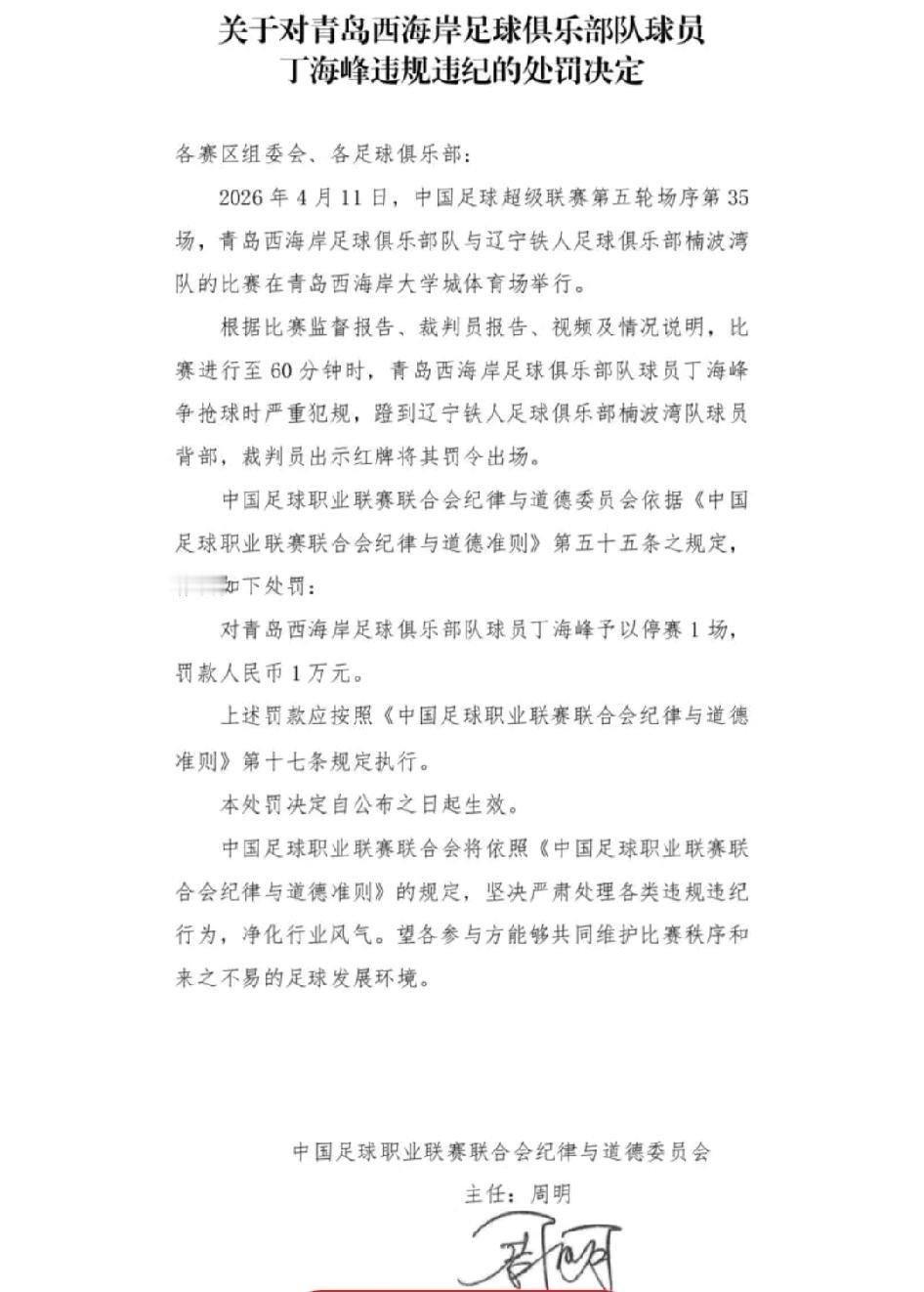 果然,青岛西海岸老将丁海峰在与辽宁铁人的比赛中暗腿伤人,没逃脱联赛官方追加处罚。 但回看这个腾空而起、背后伤人的少林功夫,中足联只对其追加停赛1场、罚款1万元。不得不说,与老米背后扯头发被加停4场处罚相比,中足联对老丁是格外开恩、手下留情。