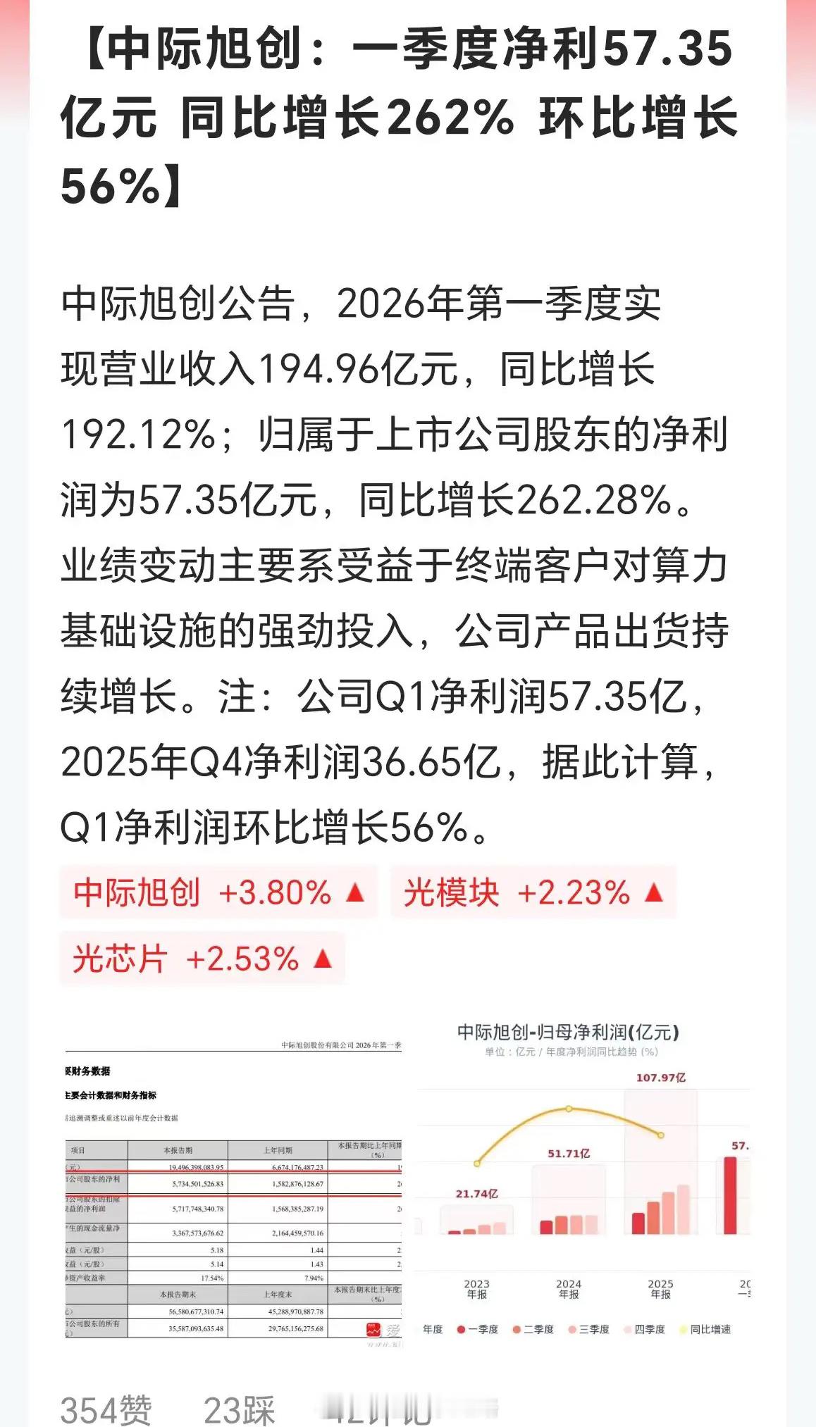 中际旭创业绩炸裂,一季度暴涨57.35亿元,同比增长262%,环比增长56%。确实太猛了!