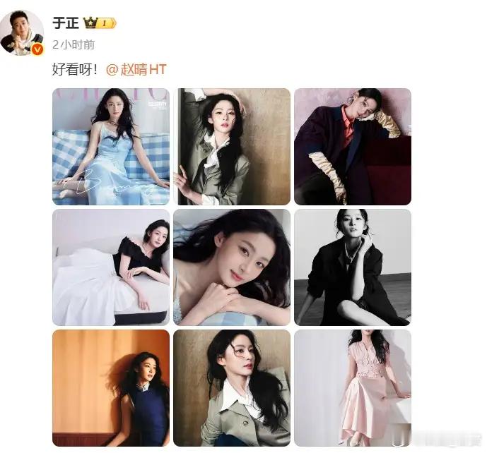 4月16日,于正晒出赵晴拍摄的杂志写真九宫格,直夸好看!“于正又夸赵晴好看了”话题冲上热搜。于正不止一次公开称赞赵晴颜值,2025年时直呼“内娱,请你苏醒过来,看一看这绝世的容颜。” 引发“强捧”争议。部分网友认为辨识度不足。支持者认可其气质与可塑性,演技也有进步。赵晴,2000年8月4日出生于黑龙江省大庆市,中国内地影视女演员,毕业于浙江传媒学院。目前待播剧《金吾不禁》被寄予厚望。