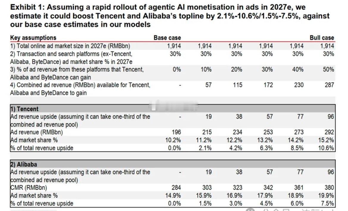 汇丰(《中国互联网:AI乐观情绪消散了吗?我们不这么认为》 尽管阿里巴巴与腾讯等公司对云业务收入作出乐观指引,其股价表现依然疲软,引发了市场对AI投资回报的疑虑。 市场担忧的核心并非AI的长期回报率,而是消费者端AI投资导致运营支出比例短期内显著上升。 但是,汇丰银行的量化模型显示,以智能体AI为驱动的广告业务具备巨大变现潜力,预计到2027年,中国在线广告市场规模将达1.9万亿元人民币。 届时,腾讯、阿里巴巴与字节跳动凭借用户规模和闭环交易能力,有望从其他平台夺取10%至50%的广告份额,为腾讯带来2.1%至10.6%的额外营收增长,为阿里巴巴带来1.5%至7.5%的增长,表明当前市场的担忧可能被夸大了。