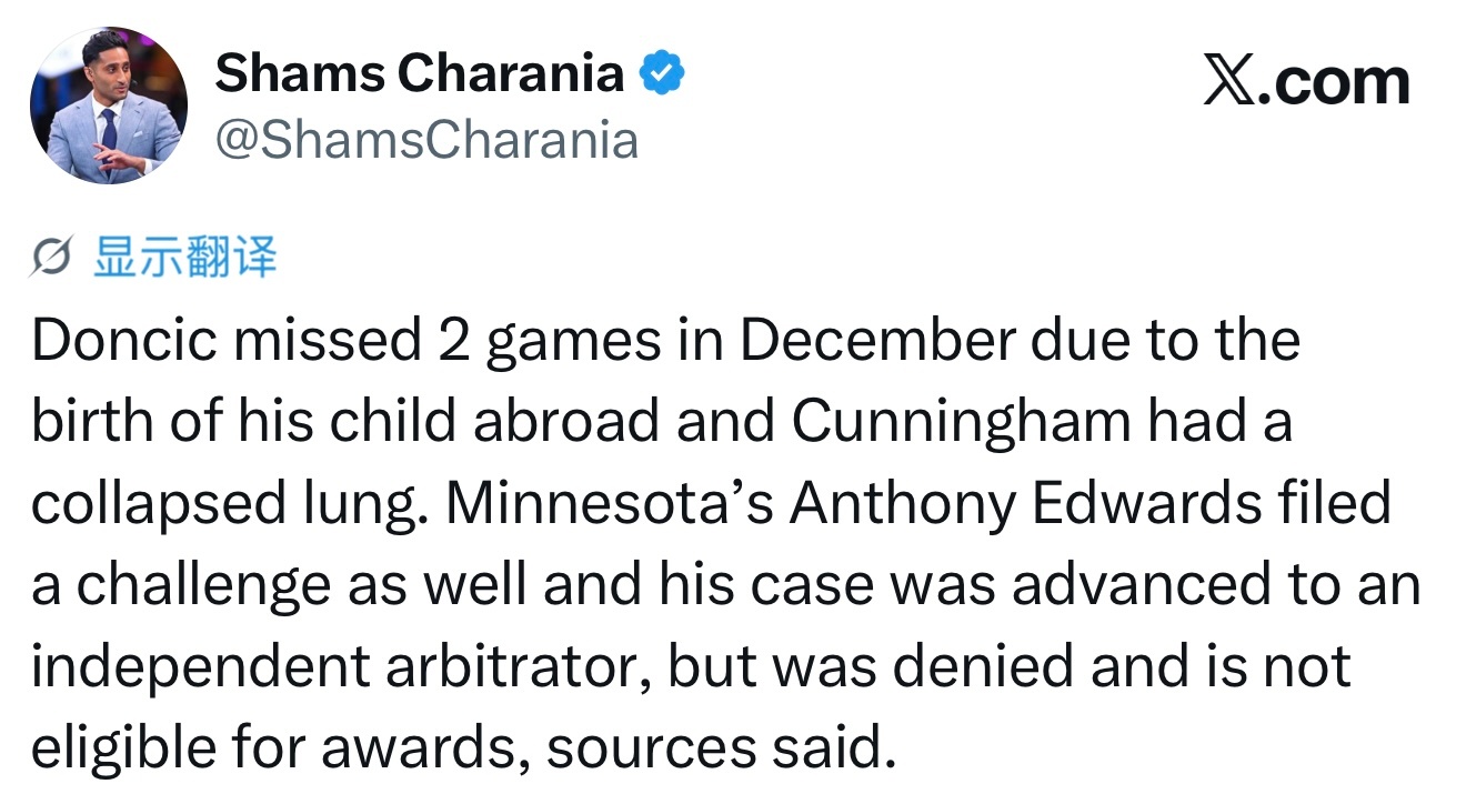 东契奇因12月在国外迎来孩子出生而缺席了两场比赛,坎宁安则因气胸缺席。爱德华兹也提出了申诉,其案件被提交给独立仲裁员,但遭到驳回,因此没有资格参与奖项评选。