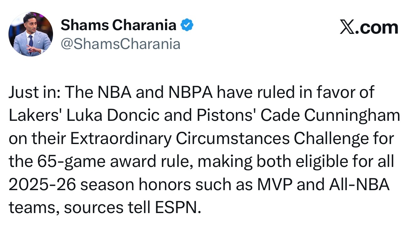 NBA联盟与球员工会已裁定东契奇和坎宁安就65场奖项评选规则提出的“特殊情况申诉”成立,两人因此均有资格竞争2025-26赛季所有荣誉,包括MVP和最佳阵容等。