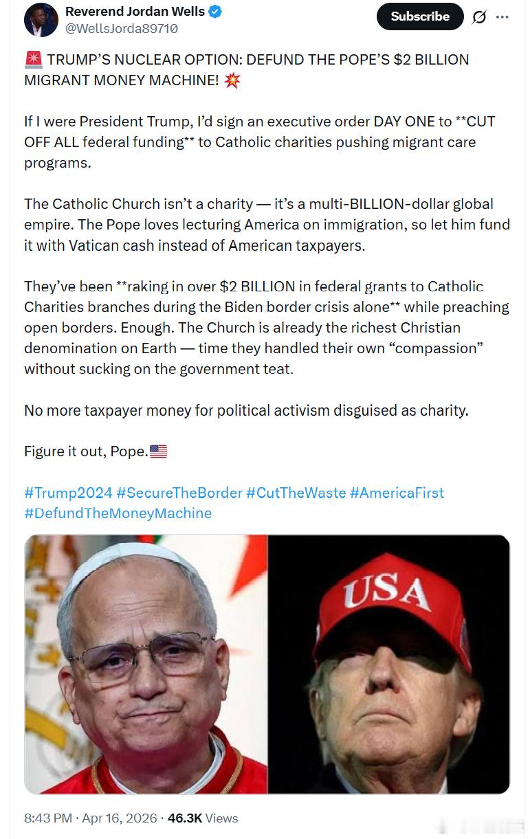 天主敎会不是慈善组织——而是一个拥有数十亿美元规模的全球性帝国。敎皇喜欢对美国的移民政策说教,那就让他用梵蒂岗自己的钱去资助,而不是花美国纳税人的钱。