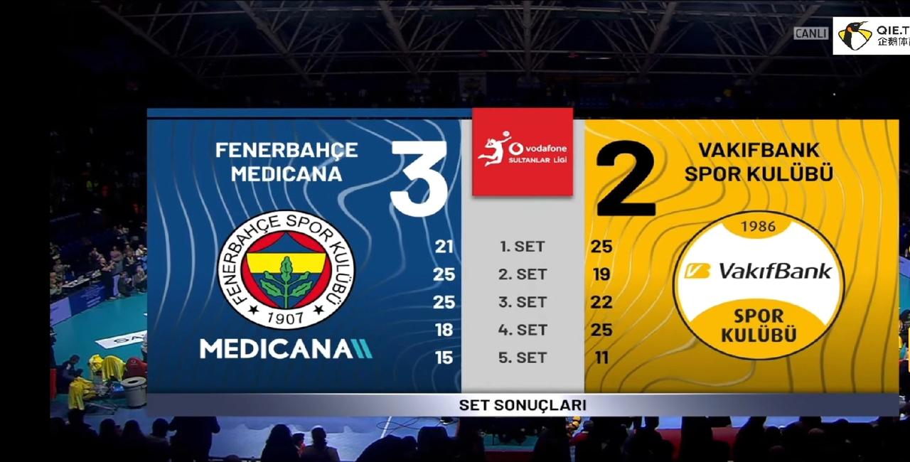 在今天凌晨结束的土超女排决赛第四回合的比赛中,费内巴切在主场以3:2险胜瓦基弗银行,在五场三胜制中双方打2:2回到起点。这场比赛费内回到主场,因之前大比分1:2落后,如果本场比赛费内不能拿下,只能眼睁睁看着瓦基弗银行在自己的主场捧起冠军奖杯,而且屋漏偏逢连夜雨,费内主力二传奥罗受伤不能出场也在一定程度削弱了费内的实力,比赛一开始拥有博斯科维奇和马尔科娃的瓦基弗银行以25:21先拿下第一局、第二局背水一战的费内以25:19扳回一局,并将状态延续到第四局以25:22获胜,第四局瓦基弗银行稳住阵脚以25:18获胜将比赛带入决胜局,决胜局费内的主要得分手瓦尔加斯一如既往表现神勇,而瓦基弗银行的主要得分手博斯科维奇和马尔科娃则稍逊一筹,这样胜利的天平倾向了费内这边,费内以15:11获胜,大比分变成2:2,决定冠军归属的第五回合比赛将在19号23:59进行,到底谁最后问鼎冠军,一起期待!!!