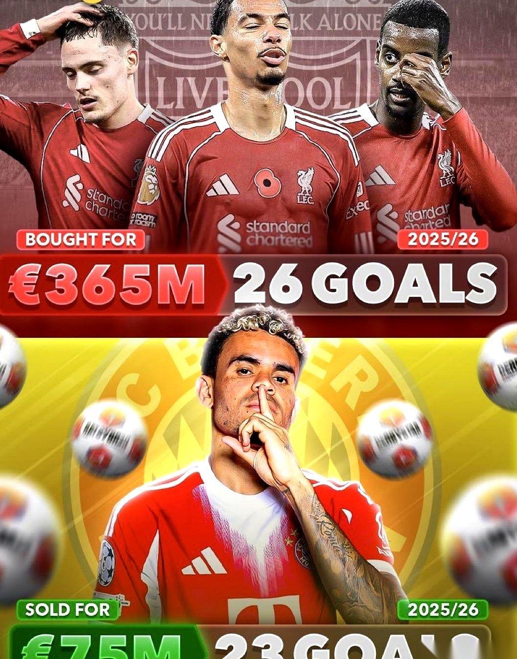 利物浦的账本摊开,一笔账,怎么算都让人后背发凉。 3.65亿欧元,一笔能让任何球队都得掂量掂量的巨款,就这么砸了出去。换来了三个名字响当当的球星:维尔茨、伊萨克、埃基蒂克。 结果呢?三个人,忙活了一整个赛季,进球数加起来,刚刚好,26个。 现在,把镜头切到慕尼黑。那个被他们用7500万欧元就“清仓”处理掉的迪亚斯,一个人,就他一个人,在拜仁几乎凭一己之力,轰进了23个球。 一边是三个人,花了3.65亿,才勉强凑出26个。 另一边是一个人,只卖了7500万,就差点追平了他们三个。 所以说,这笔买卖,到底是精打细算,还是亲手把自家大腿卸下来送给了对手?