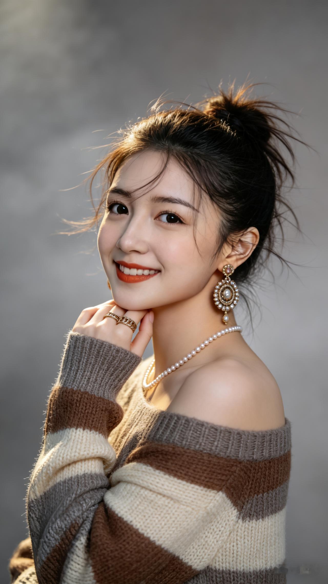 女生梳慵懒凌乱半扎发,碎发轻扬,清透暖调裸妆配橘红唇釉。棕灰米拼色粗针织露肩毛衣,肩颈柔美,戴复古金属圆牌耳饰、戒指与珍珠细链,指尖轻触耳坠。灰调渐变背景柔光朦胧,松弛慵懒。