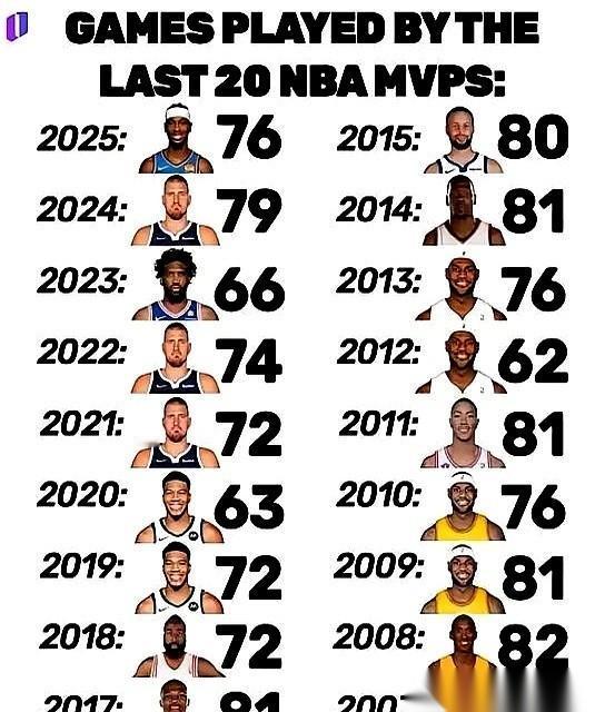 翻开现在NBA的MVP候选名单,那个出场数,让人把手机拿远了一点,又凑近看了一遍。 去年恩比德66场,拿了。今年亚历山大68场,已经是劳模。文班亚马天赋再好,因为场次不够,评选资格直接被新规则一笔勾销。 有人说,这就是极限了。 可数据不会撒谎。表格一行行往回拉,拉到2008年,一个名字在那儿戳着,后面跟着一个数字:82。科比·布莱恩特。 那一年,他不止是82场常规赛一场不落,夏天还扛着国旗去打了奥运会,回过头又一路杀进总决赛,赛程表密得像一张蜘蛛网,他就这么一场一场地撞了过去。 那之后呢?强如詹姆斯、字母哥拿到MVP的年份,也都是缩水赛季。 “满勤”两个字,以前是巨星的标配,现在听着,像一句从老磁带里飘出来的口号。 所以,到底是现在的球员更会算账,还是以前的篮球,打法真的不一样?