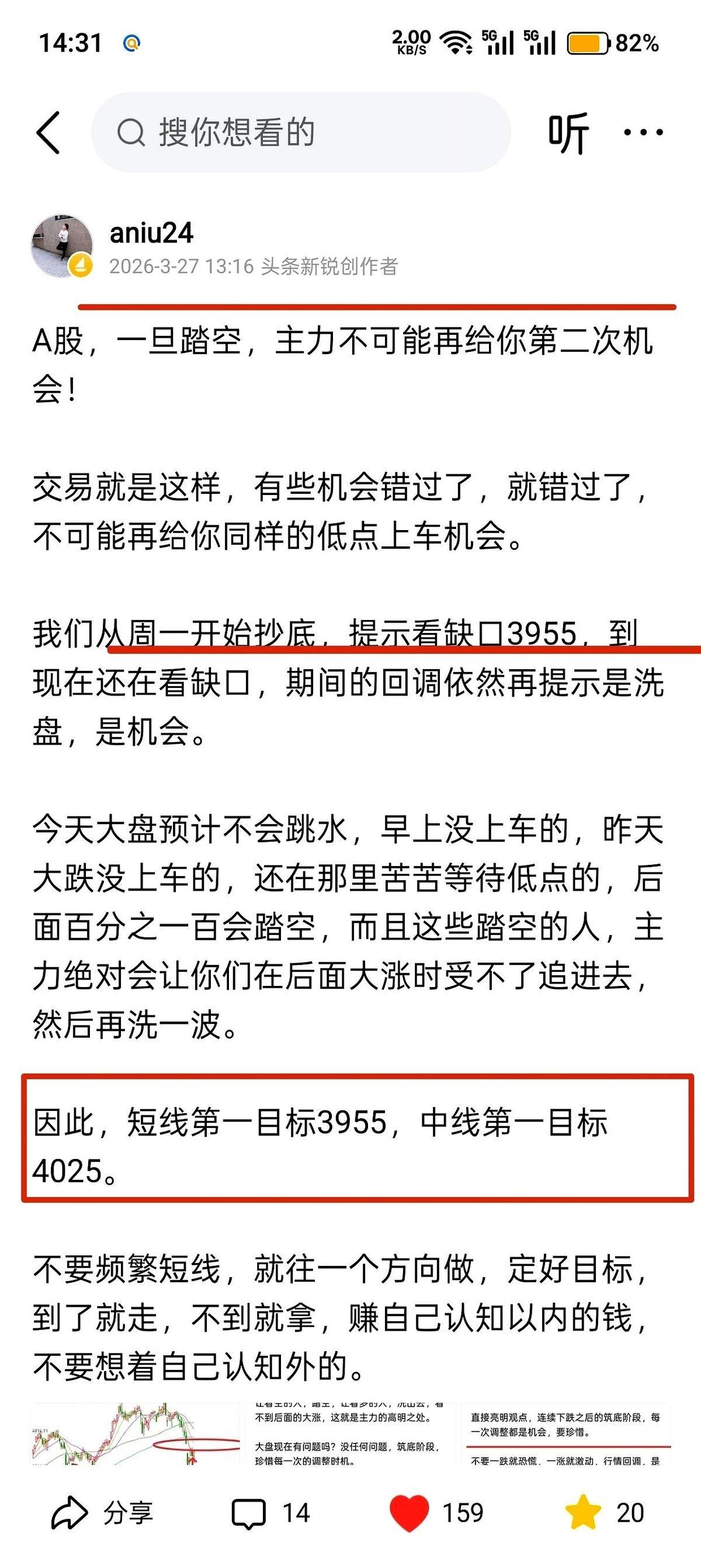 有人,把A股最近半个月的走势,几乎写成了一个剧本。 3月23号,大盘绿得让人心慌,他直接喊话:抄底。目标,4025点。 话音刚落,行情果然开始震荡爬升。他补了一句:在到3955点之前,任何一次下跌,都是给你上车的机会。 4月1号,指数精准碰到3955。正当所有人准备加仓大干一场时,他却反手一挥:减仓,等二次探底。 两天后,大盘应声下跌。他又画出两条线:3900点附近,第一批进;3850点,第二批跟上。 所有人眼看着指数,就在他画的线附近来回摩擦。 直到昨天,指数的数字一格一格跳向4025,所有人的心都提到了嗓子眼,他却在屏幕前敲下两个字:离场。一个不留,全部清空,把第一阶段反弹的最后一分利润,稳稳揣进兜里。 剧本,翻到了第二页。 规则,彻底变了。 他说,第一阶段,是震荡上行,回调可以闭眼进。现在,是第二阶段,震荡下行,再回调,就是陷阱。 以前,每一次下跌都是冲进去捡钱。现在,每一次反弹,可能都是最后的逃生窗口。 所以,别动,先躲过这一轮。真正的大机会,要等这波风险出清了才会来。