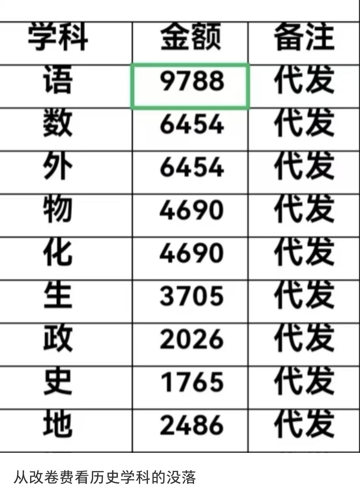 这张高中老师的改卷费表格看着挺有意思,其实就是个照妖镜,把山河四省某地的高中选科的残酷现实给照得清清楚楚。 你看那个“语”字打头的金额,9788元,直接碾压全场,比数学、外语高出一大截,更是政史地的好几倍。这说明啥?说明语文老师改卷改得最累!高考作文、阅读理解这些主观题多,机器改不了,全靠老师盯着屏幕一个个抠字眼、给分,费时费力,自然拿钱多。反观政史地,尤其是历史,金额才1765元,低得可怜。为啥?因为这几科选的人少,加上选择题多主观题相对少,电脑一扫描,标准答案一对,几分钟就能批完一个班,效率高了,单价自然就下来了。数学英语现在甚至可以全智批,只有语文就几分默写可以智批,月考什么的为了准确也不能智批。现在的学生都写不好中国字,能写好英文字母? 再看学科分布,物理、化学(4690元)虽然比语数外低,但比政史地高一大截。这背后的逻辑也很直白:物化选科的人多,加上难度大题目活,改卷老师得动脑,不敢马虎,所以费用高。这也侧面印证了选物理、化学的学生多,卷子量大,改卷任务重。 结合山河四省类似衡水中学的学校多、竞争激烈的大环境,这种改卷费的差异,其实就是选科热度的风向标。物理类和偏理科的组合依然是主流,而纯文科(政史地)被冷落,不仅学生怕难怕赋分低,连老师改卷都改得“心累钱少”。这表不光是钱的事儿,更是无数学生和家长在高考赛道上精打细算后的真实写照。 注意,这是某一学校所有老师的,改一份卷只几分钱,可以看出3+1+2高考情况下各科的选科人数和热度。 而北京呢,高考选科是3+3,我估计至少地理选科的人会比较多,齐平甚至多于生物。