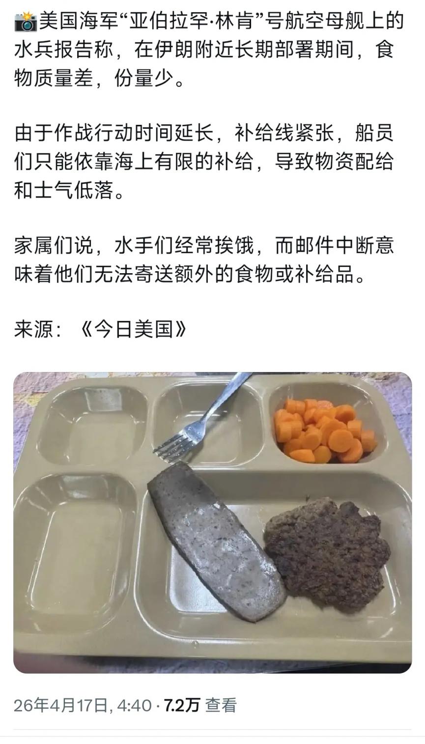 近日,据美媒爆料称,美国林肯号航母上的水兵吐槽在伊朗附近长期部署期间,食物质量差,份量少。 看配图的水兵餐食,确实有点惨!跟美国防长赫格赛斯的大龙虾、大牛排形成了鲜明对比。这一巨大的反差,瞬间在网络上引发了轩然大波。那些身处一线、为美国所谓“海外利益”卖命的水兵们,每日只能对着寡淡少味、量又不足的餐食发愁,而高层却在享受着奢华的美食。 此次水兵的吐槽和餐食的巨大差异,或许只是美国军队诸多问题中的冰山一角。曾经蓝星最强的美军,正在一步步滑向“印度化”的泥潭!