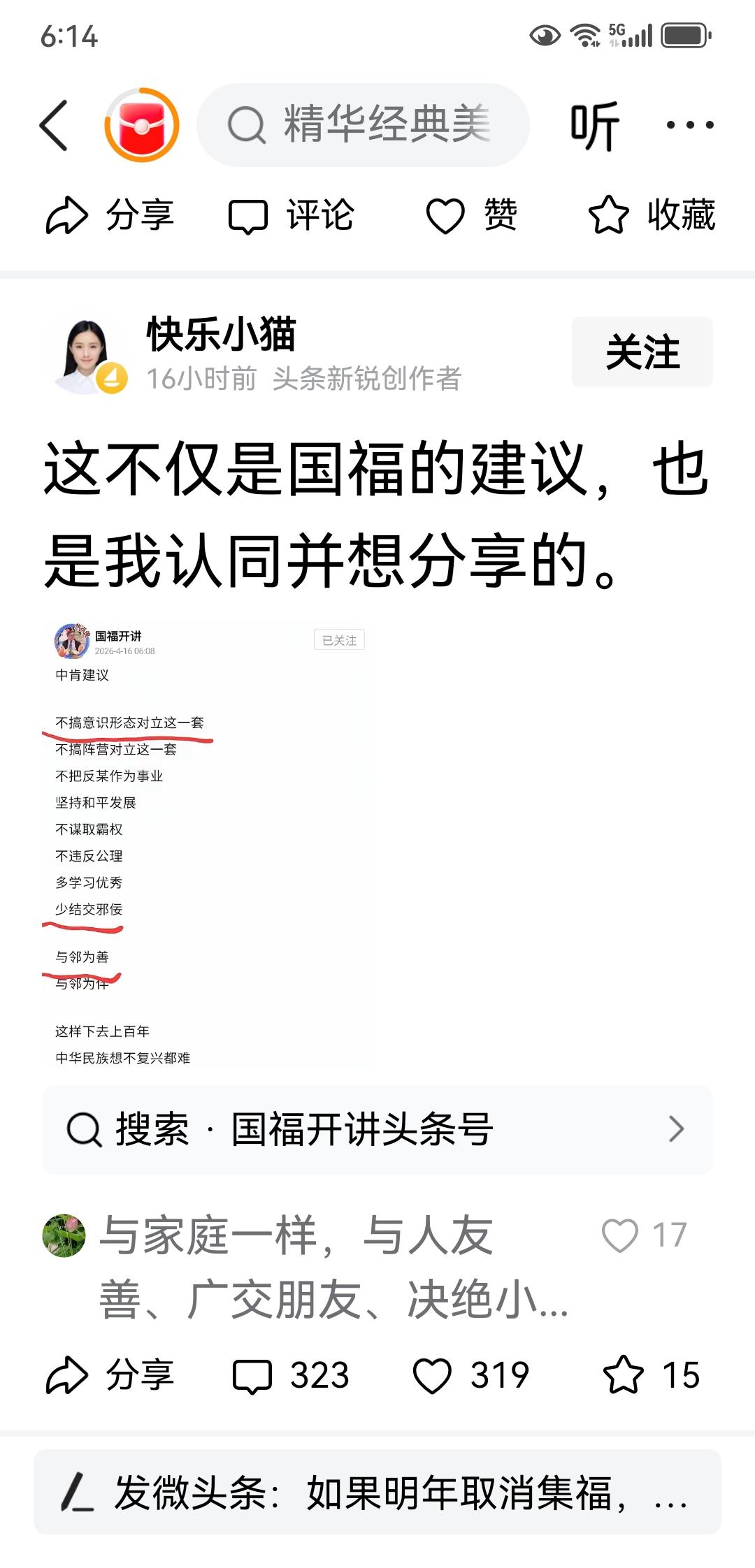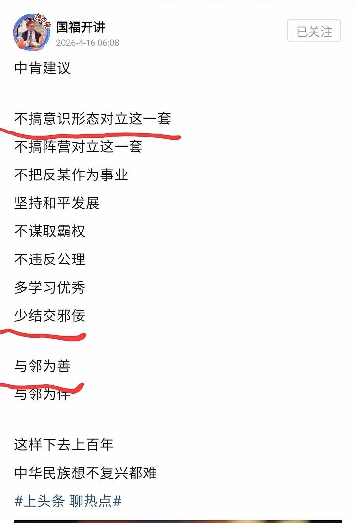 公知、傻白甜、圣母、腐儒话术而己一一不以为耻,反以为荣! 你要不搞意识形态对立一一中国改革开放后国家间交往不再提意识形态对立了,但西方却认为你价值观与他们不同,你是否要中国与美西方意识形态相同? 你要不搞阵营对抗一一但美国要搞,北约要搞,你赖之何?中国要跪下投降、废除国防吗? 你要不搞霸权一一但美国要搞,要与中国贸易战、科技战、舆论战、金融战、关税战,只差枪炮热战了,中国只有忍受霸凌、不能反抗? 你要不以反美为事业一一中国改革开放以来,以发展经济为要务,何时以反美为事业了?但近十年美国却以中国为主要竞争对手、敌对国家; 你要与邻为善一一改革开放以来,中国没有与周边邻国发生战争,但从蒙古国到日韩菲印等,却数次以小欺大、登鼻子上脸,中国都忍耐克制、与邻为善。你要中国今后都一直以德报怨吗?那何以报德? 你要不违反公理一一中国是联合国宪章、国际法和世界贸易规则的坚定支持者,这些都是世界最大公理,而美国却连会费都可以拖欠,多少次侵略战争绕开联合国而任意开战?你看不见谁违反公理吗? 你要少接交邪侫一一中国是广交朋友,不以意识形态为国家交往的羁绊,但有人要以价值观交友,你所谓的邪佞国家就是单方面的价值观判断。 所有这些,你应该去对美国、西方国家说教、宣传和提点,而不是针对中国。 所以,中国的公知、傻白甜、圣母、腐儒们似是而非的话术妖言惑众害人不浅,自宋以来祸国殃民遗害中国上千年!