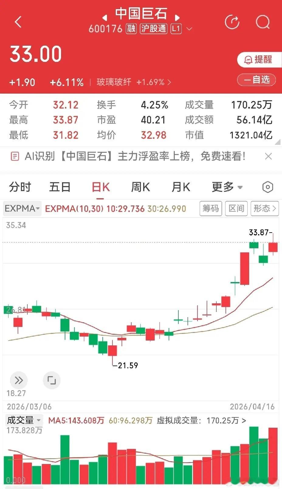 中国巨石走出趣味笑脸形态,整体上行趋势稳固,量能温和有序。虽并非标准三红笑脸,左侧两根绿K稍显美中不足,但整体结构依旧健康,稳步向上。