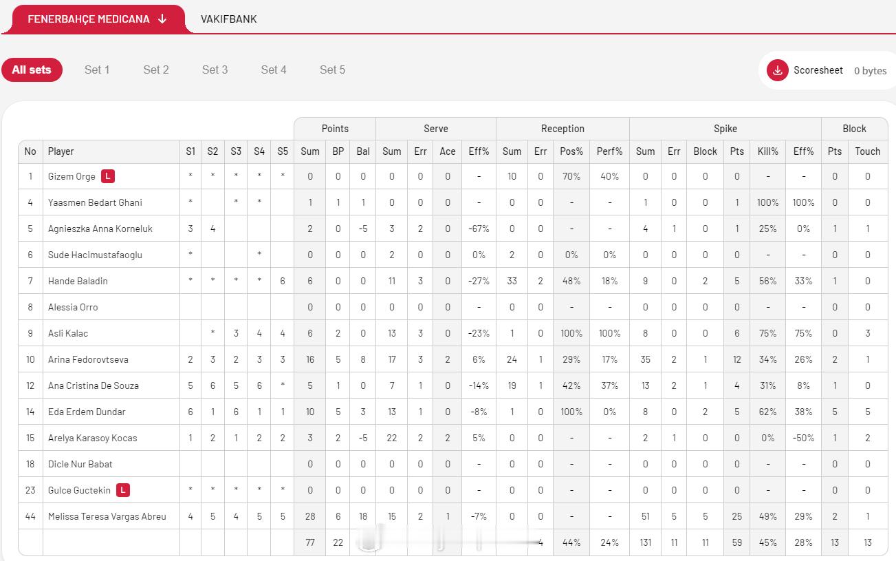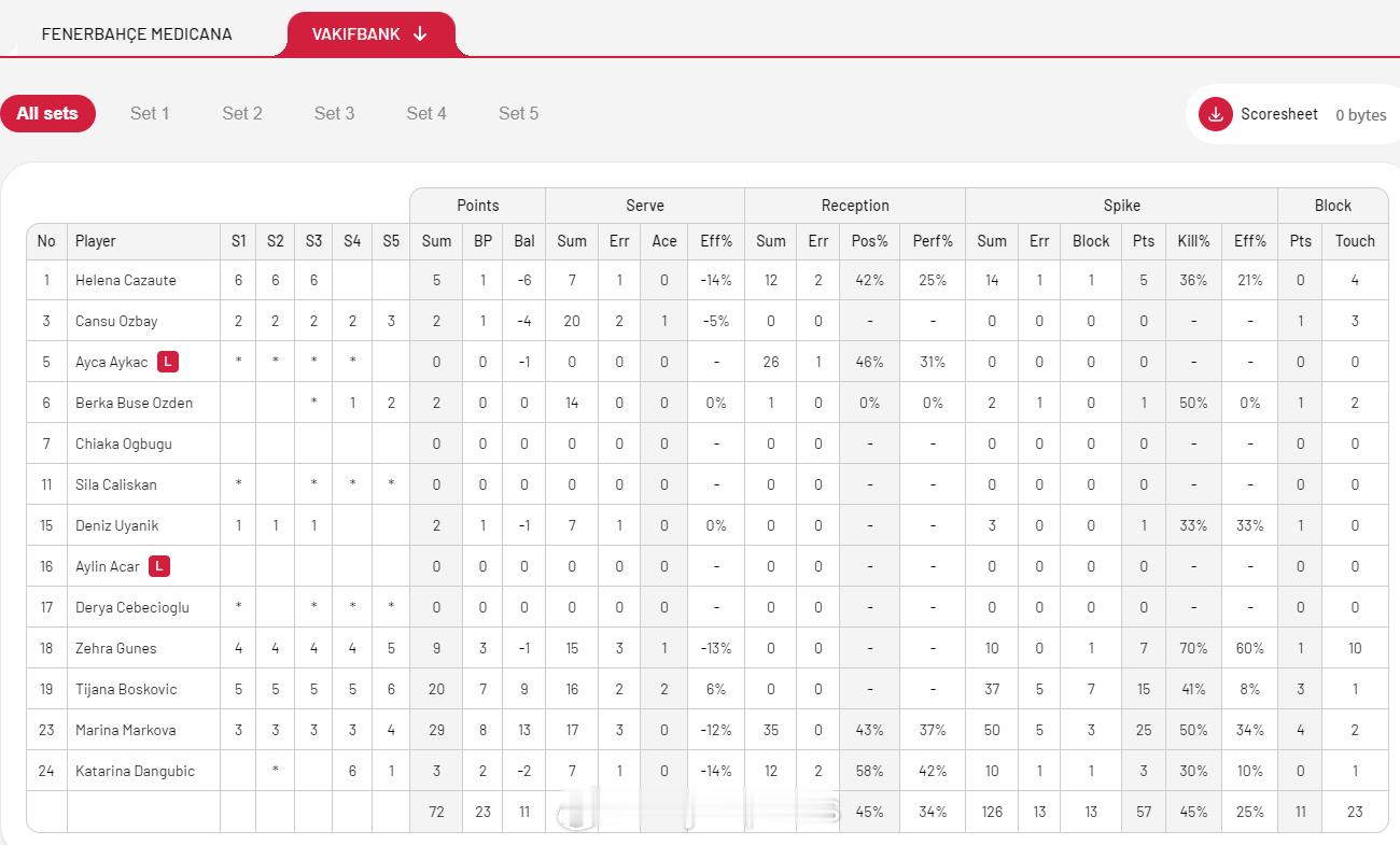 【土超女排决赛IV费内3-2瓦基弗扳平总比分 巴尔加斯28分马尔科娃29分】国际排坛战报速递 4月16日伊斯坦布尔,土超女排决赛第四回合,费内巴切主场3-2(21-25/25-19/25-22/18-25/15-11)力克瓦基弗银行,将总比分扳成2-2,把冠军悬念留到了北京时间4月20日凌晨。巴尔加斯28分、费多罗夫采娃16分、艾达10分,马尔科娃29分、博斯科维奇20分。