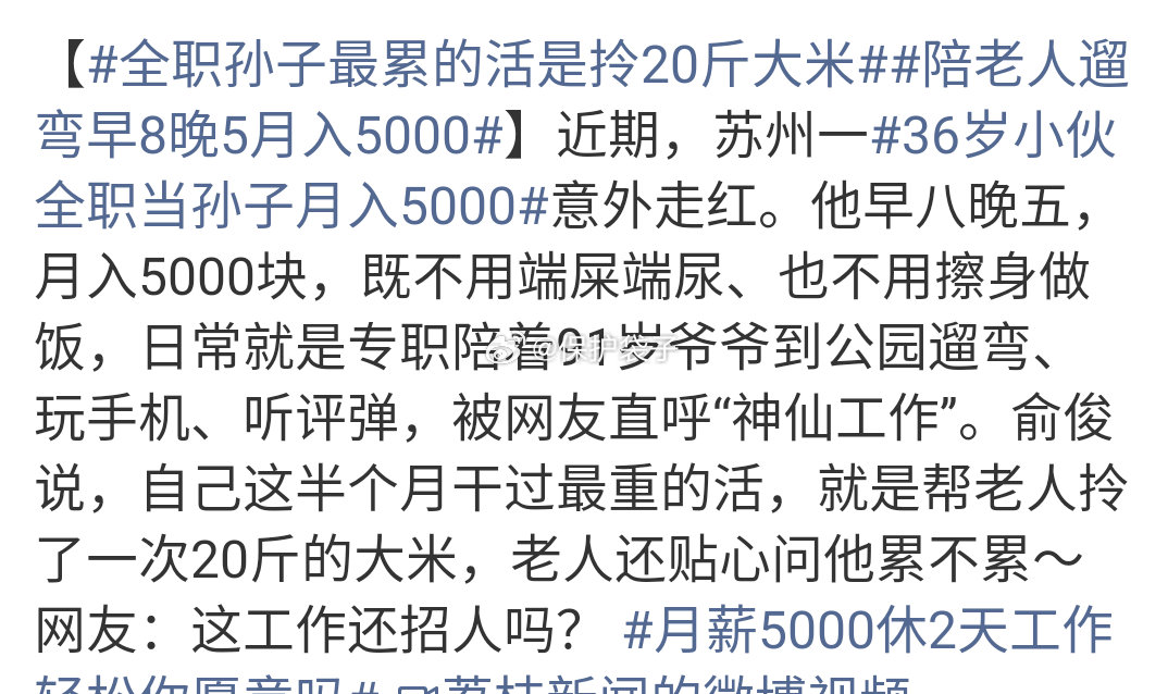 36岁小伙全职当孙子月入5000总归一个字,都是穷给闹的。可能用不了十年,银发行业就真正会成为朝阳产业。但还是继续需要人工投入会很难,不仅是用工缺口很大,更多的是伺候老年人其实并不只有看到的溜溜公园聊聊天那么简单,多数还是跟在医院里照顾躺着起身困难的护士护工一样的情况。还有,并不是所有老人都能拿着七八九千一万两万的退休金