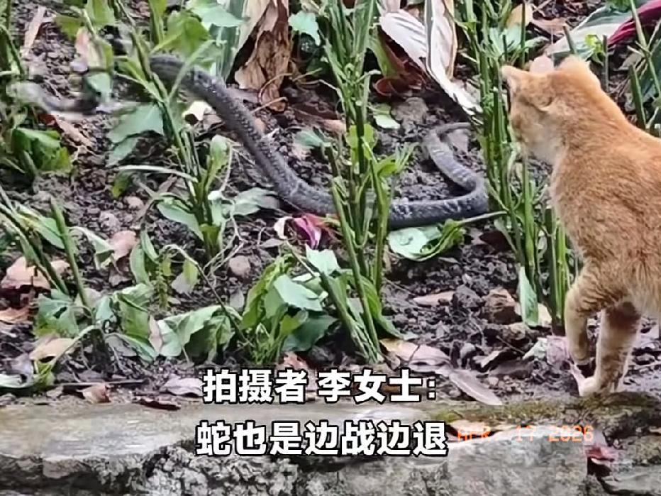 近日广东广州,一女子在越秀公园散步,突然,她听到丛林里传来声音,回头一看是条1米5的眼镜蛇!就在这时,它出手了! 女子发现丛林里一条眼镜蛇正向她赶来,吓得大叫了起来,这一叫声被旁边的猫猫听到了,及时赶过来挡在了女子和蛇之间,和蛇缠斗了三四分钟,双方没有分出胜负,猫咪没有主动出击,蛇也是边战边退,最后溜走了!正义猫咪成功保护了女子的安全,女子觉得这只猫咪是正义的化身啊,舍身救人!