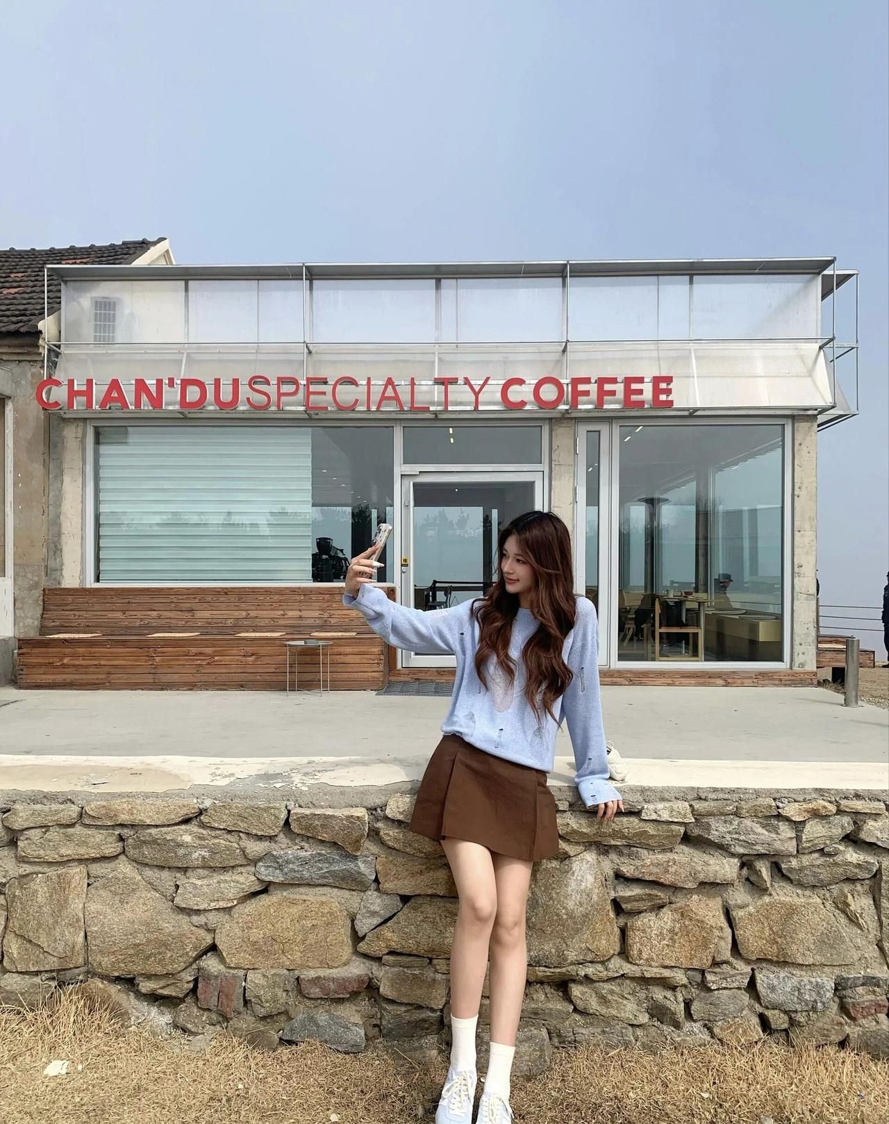 阳光明媚的午后,少女在咖啡馆自拍,享受悠闲时光。