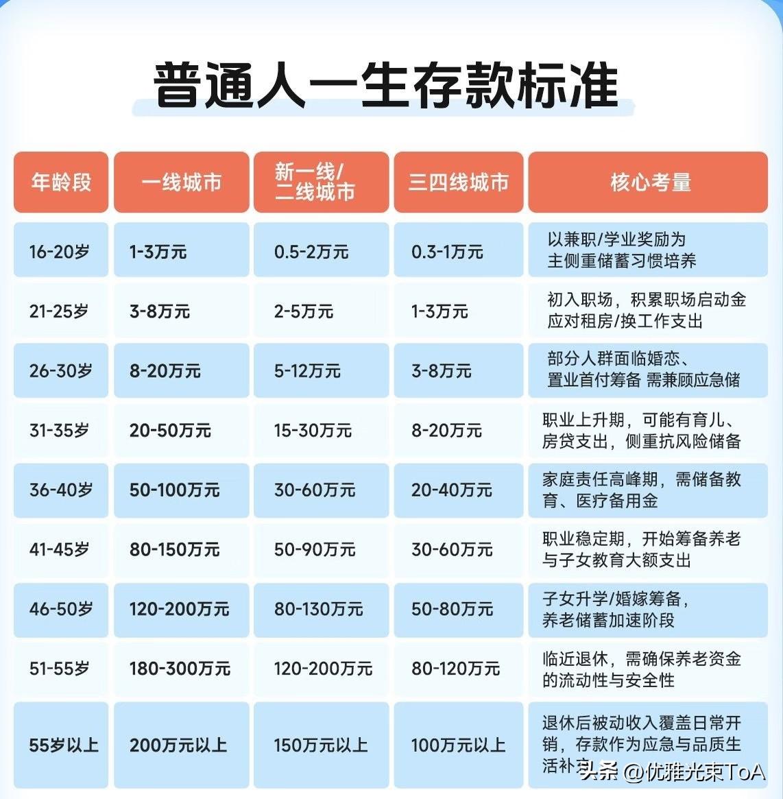 普通人一生该存多少钱?不同城市标准出炉,看看你达标了没☞☞☞ 家人们,有没有算过这辈子得攒多少钱才够花?不同城市、不同年龄,标准差得还真不少 16-20岁:还在上学的年纪,一线城市存1-3万,三四线0.3-1万就行,主要是养成存钱习惯,兼职和压岁钱别乱花; 21-25岁:刚上班没多久,一线城市得备3-8万,租房、换工作都要花钱,新一线/二线2-5万,三四线1-3万,手里有粮心里不慌; 26-30岁:开始琢磨婚恋、买房首付了,一线城市8-20万,新一线5-12万,三四线3-8万,应急的钱也得留够; 31-35岁:上有老下有小,抗风险最重要!一线20-50万,新一线15-30万,三四线8-20万,应对育儿、房贷才不慌; 40岁后:养老和子女教育得提前筹谋,一线46-50岁要存120-200万,55岁后至少200万以上,新一线和三四线稍低,但也得奔着100万+去。 其实啊,这只是参考,毕竟每个人生活节奏不同。重点是量力而行,慢慢攒,日子总会越来越稳。你现在的存款,够得上哪个阶段?评论区聊聊~ 存款标准