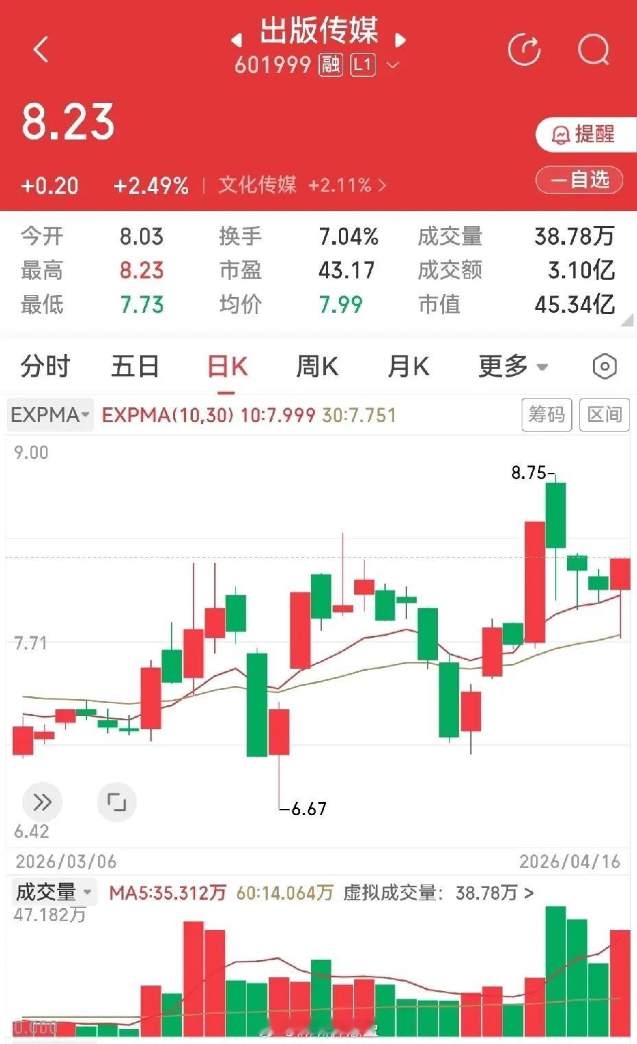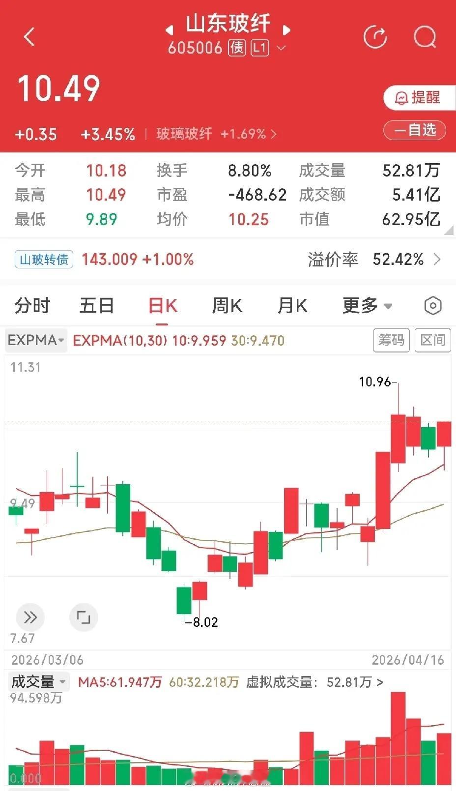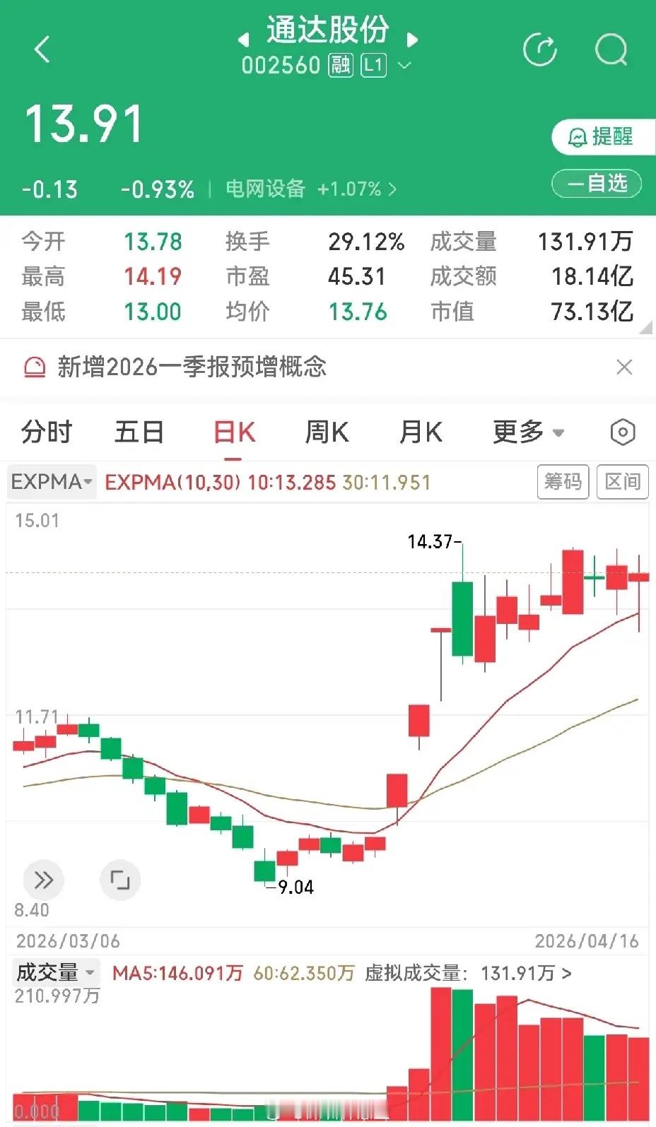 三个大长腿,实际上下引线都不是太长,形态也不太一样。出版传媒,涨停板后回调,昨天的大长腿正好跌到单阳底部位置,然后拉回到生命线之上,收阳线小涨两个多点。山东玻纤,涨停板后连续四天在涨停板上方横盘震荡,昨天盘中跌破涨停板高点,尾盘又拉上来了,横盘姿态没变。通达股份,去年一直看好此股,主要是业绩好,但是一直没什么表现,直到三月底才开始启动,一启动就是三连板,反应不过来。现在是三连板后的横盘,九天了。