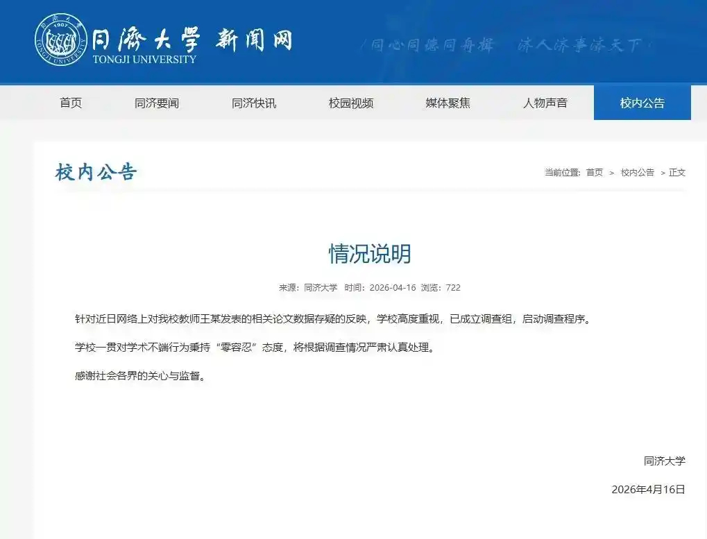 针对近日网络上对我校教师王某发表的相关论文数据存疑的反映,学校高度重视,已成立调查组,启动调查程序。