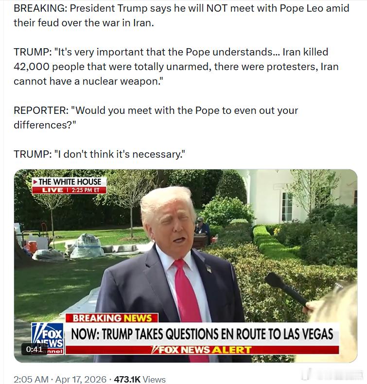 特朗普:“非常重要的是让教皇明白……伊朗S害了4.2万名手无寸铁的人,他们都是坑议者。伊朗绝不能拥有核武器。”