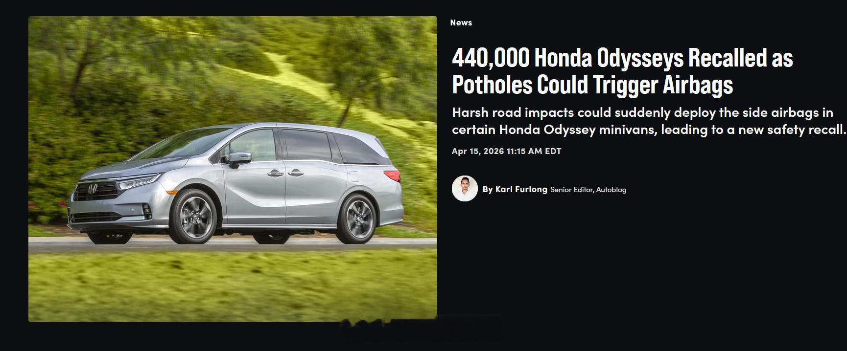 坏消息:本田汽车召回了440830台2018-2022款美版奥德赛,其二三排侧安全气囊存在软件瑕疵,行驶在颠簸路面时可能意外引爆。目前NHTSA已收到130起报告,25人受伤;