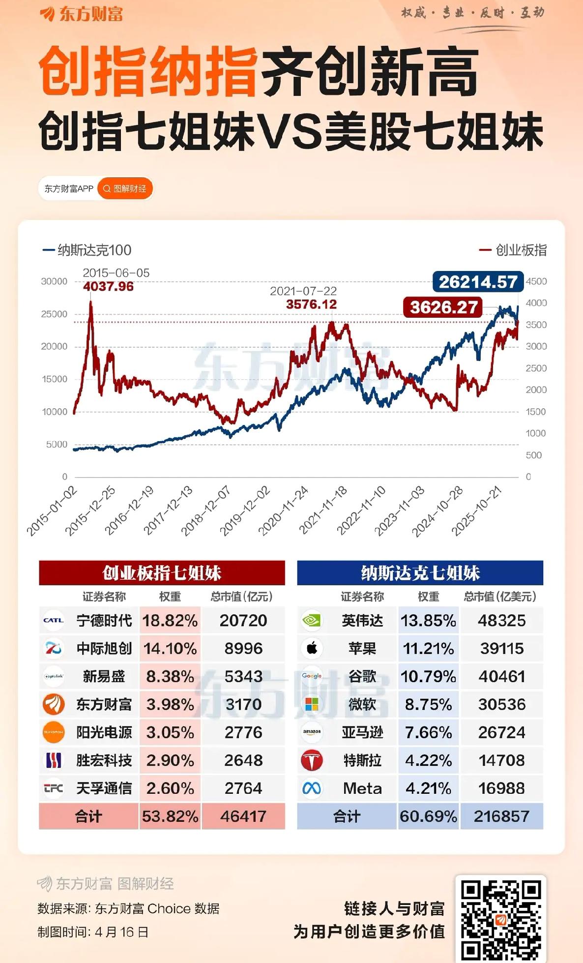 创业板对标纳斯达克很有志气,但所谓的创业板“七姐妹”还差了点成色。 看东方财富网画的图,代表创指的红线与代表纳指的蓝线如影形随、齐驾齐驱,主要因为双方“七姐妹”都很给力,占了权重过半的比例。 但看市值,纳指的英伟达、苹果、谷歌、微软、亚马逊、特斯拉、Meta,合计达21万亿美刀,而创指的宁德时代、中际旭创、新易盛、东方财富、阳光电源、胜宏科技、天孚通信,合计达4.6万亿RMB。 特别是创指“七姐妹”行业分布:宁王做电池及储能、阳光做光伏设备、胜宏做PCB,算是各有新天地;而“易中天”都做光模块,是内卷在一起;至于东财,本质上就一券商股,一直在拖创指的后腿。 当人工智能、机器人、无人驾驶、商业航天等行业有新巨头冒出来时,“七姐妹”的说法才合理。