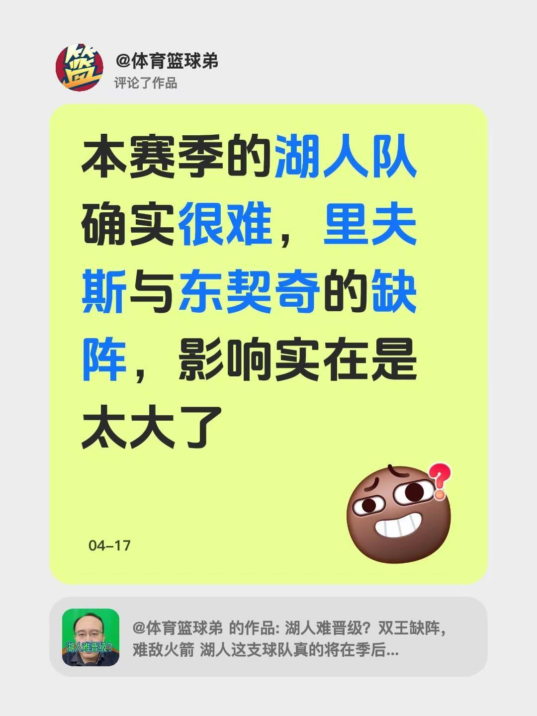 我评论了@体育篮球弟 的作品:本赛季的湖人队确实很难,里夫斯与东契奇的缺阵,影响实在是太大了